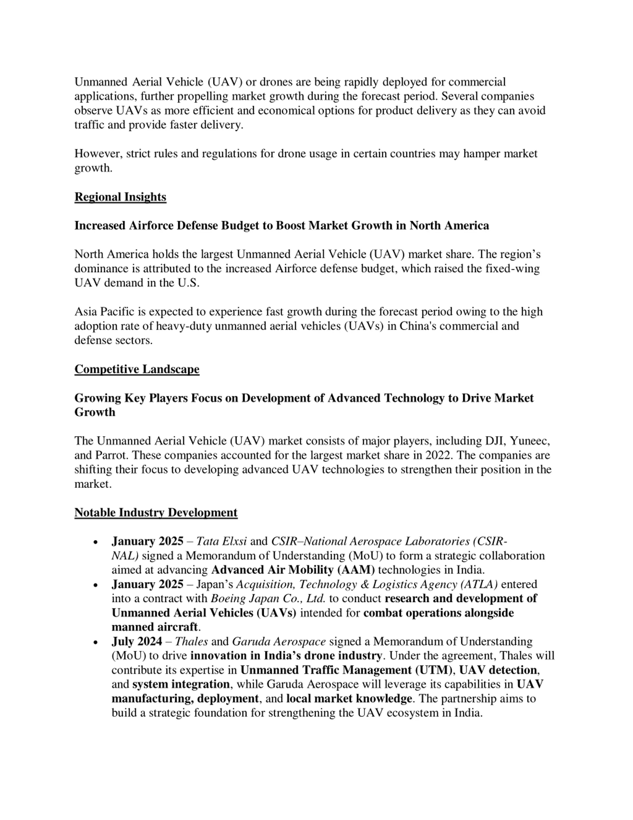 Unmanned Aerial Vehicle (UAV) or drones are being rapidly deployed for commercial applications, further propelling market growth during the forecast period. Several companies observe UAVs as more efficient and economical options for product delivery as they can avoid traffic and provide faster delivery. However, strict rules and regulations for drone usage in certain countries may hamper market growth. Regional Insights Increased Airforce Defense Budget to Boost Market Growth in North America North America holds the largest Unmanned Aerial Vehicle (UAV) market share. The region s dominance is attributed to the increased Airforce defense budget, which raised the fixed-wing UAV demand in the U.S. Asia Pacific is expected to experience fast growth during the forecast period owing to the high adoption rate of heavy-duty unmanned aerial vehicles (UAVs) in China's commercial and defense sectors. Competitive Landscape Growing Key Players Focus on Development of Advanced Technology to Drive Market Growth The Unmanned Aerial Vehicle (UAV) market consists of major players, including DJI, Yuneec, and Parrot. These companies accounted for the largest market share in 2022. The companies are shifting their focus to developing advanced UAV technologies to strengthen their position in the market. Notable Industry Development January 2025 Tata Elxsi and CSIR National Aerospace Laboratories (CSIR- NAL) signed a Memorandum of Understanding (MoU) to form a strategic collaboration aimed at advancing Advanced Air Mobility (AAM) technologies in India. January 2025 Japan sAcquisition, Technology & Logistics Agency (ATLA) entered into a contract with Boeing Japan Co., Ltd. to conduct research and development of Unmanned Aerial Vehicles (UAVs) intended for combat operations alongside manned aircraft. July 2024 Thales and Garuda Aerospace signed a Memorandum of Understanding (MoU) to drive innovation in India s drone industry. Under the agreement, Thales will contribute its expertise in Unmanned Traffic Management (UTM), UAV detection, and system integration, while Garuda Aerospace will leverage its capabilities in UAV manufacturing, deployment, and local market knowledge. The partnership aims to build a strategic foundation for strengthening the UAV ecosystem in India.