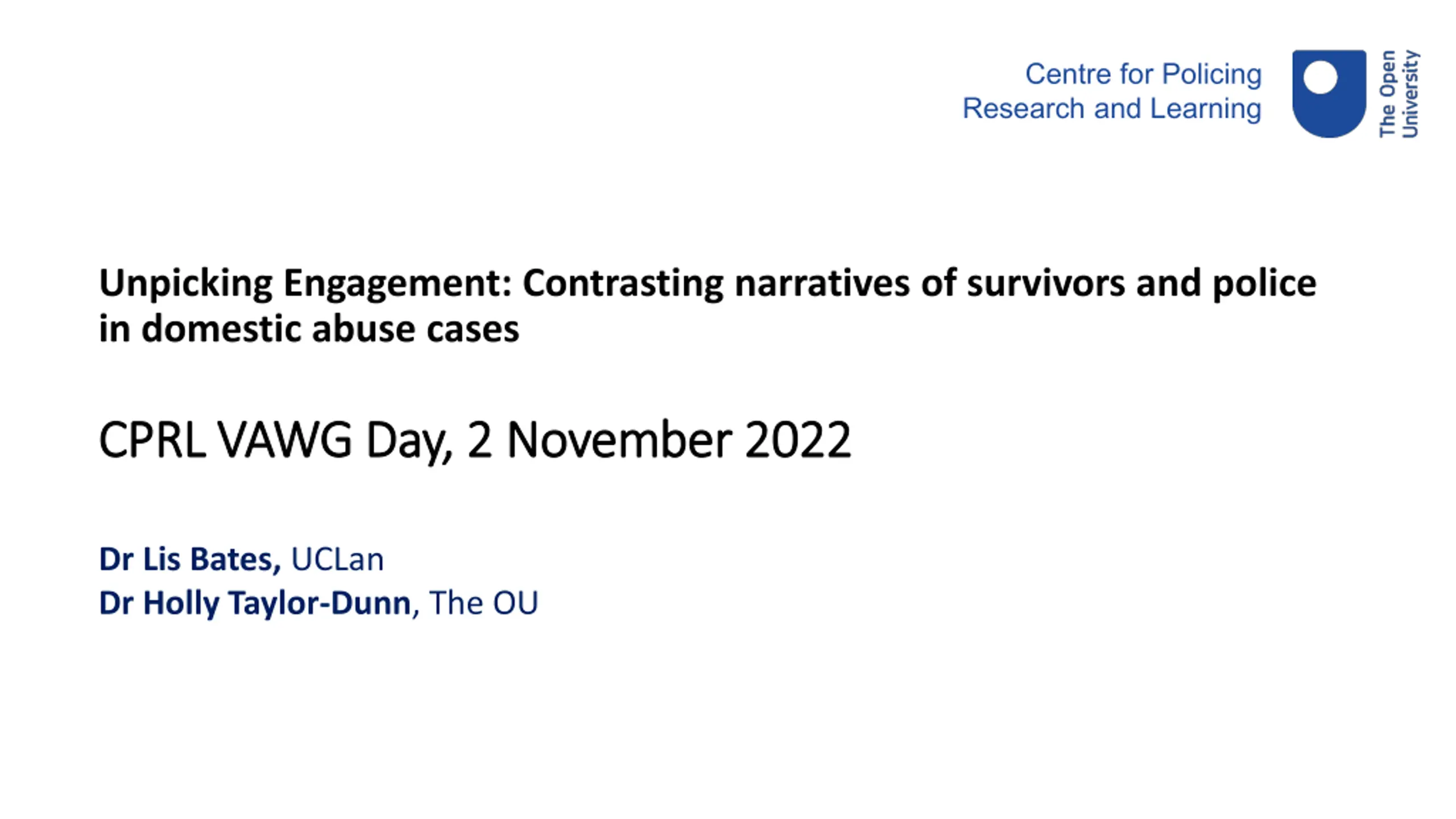 Centre for Policing Research and Learning Unpicking Engagement: Contrasting narratives of survivors and police in domestic abuse cases CPRL VAWG Day, 2 November 2022 CPRL VAWG Day, 2 November 2022 Dr Lis Bates, UCLan Dr Holly Taylor-Dunn, The OU