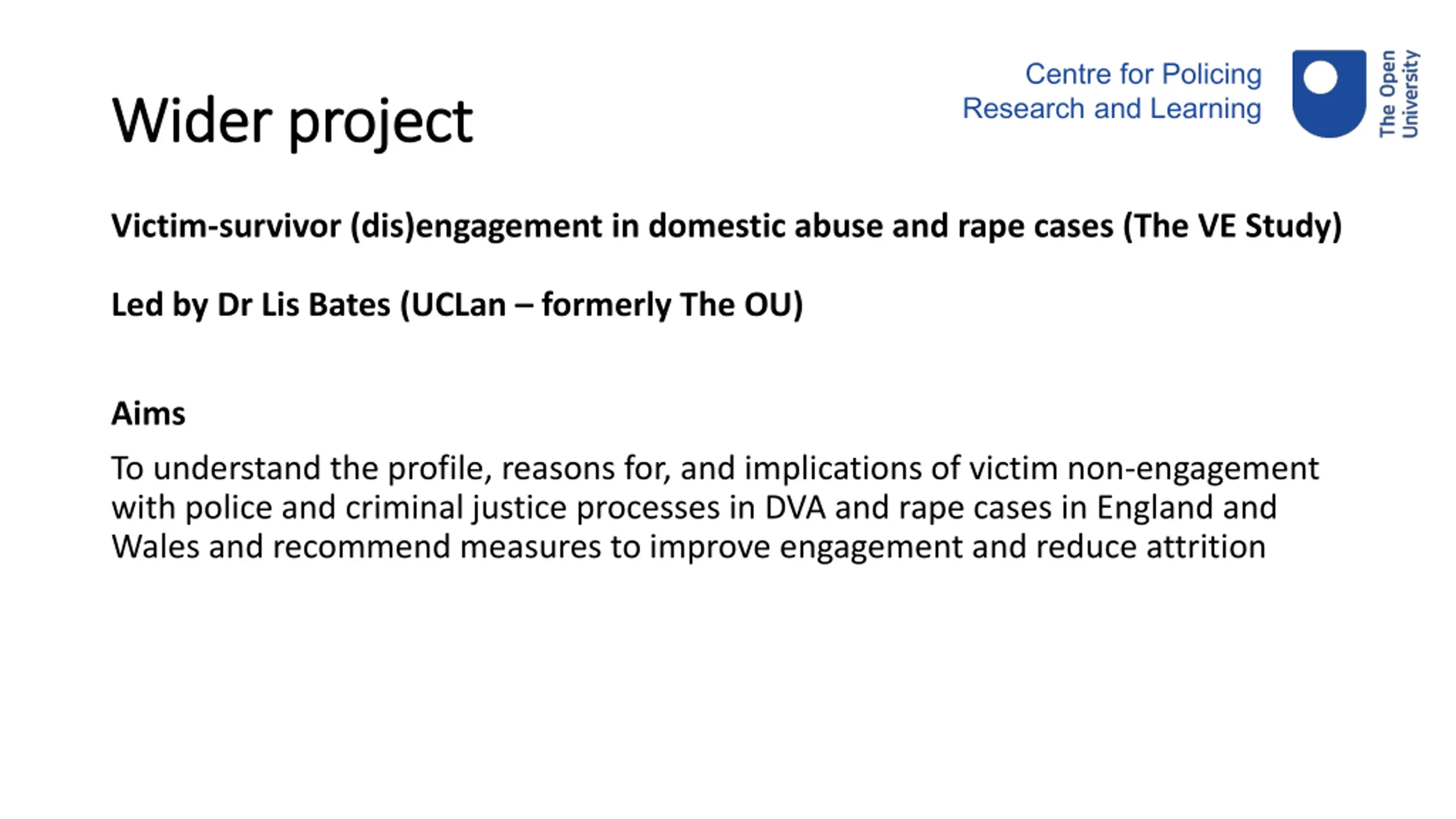 Centre for Policing Research and Learning Wider project Wider project Victim-survivor (dis)engagement in domestic abuse and rape cases (The VE Study) Led by Dr Lis Bates (UCLan formerly The OU) Aims To understand the profile, reasons for, and implications of victim non-engagement with police and criminal justice processes in DVA and rape cases in England and Wales and recommend measures to improve engagement and reduce attrition