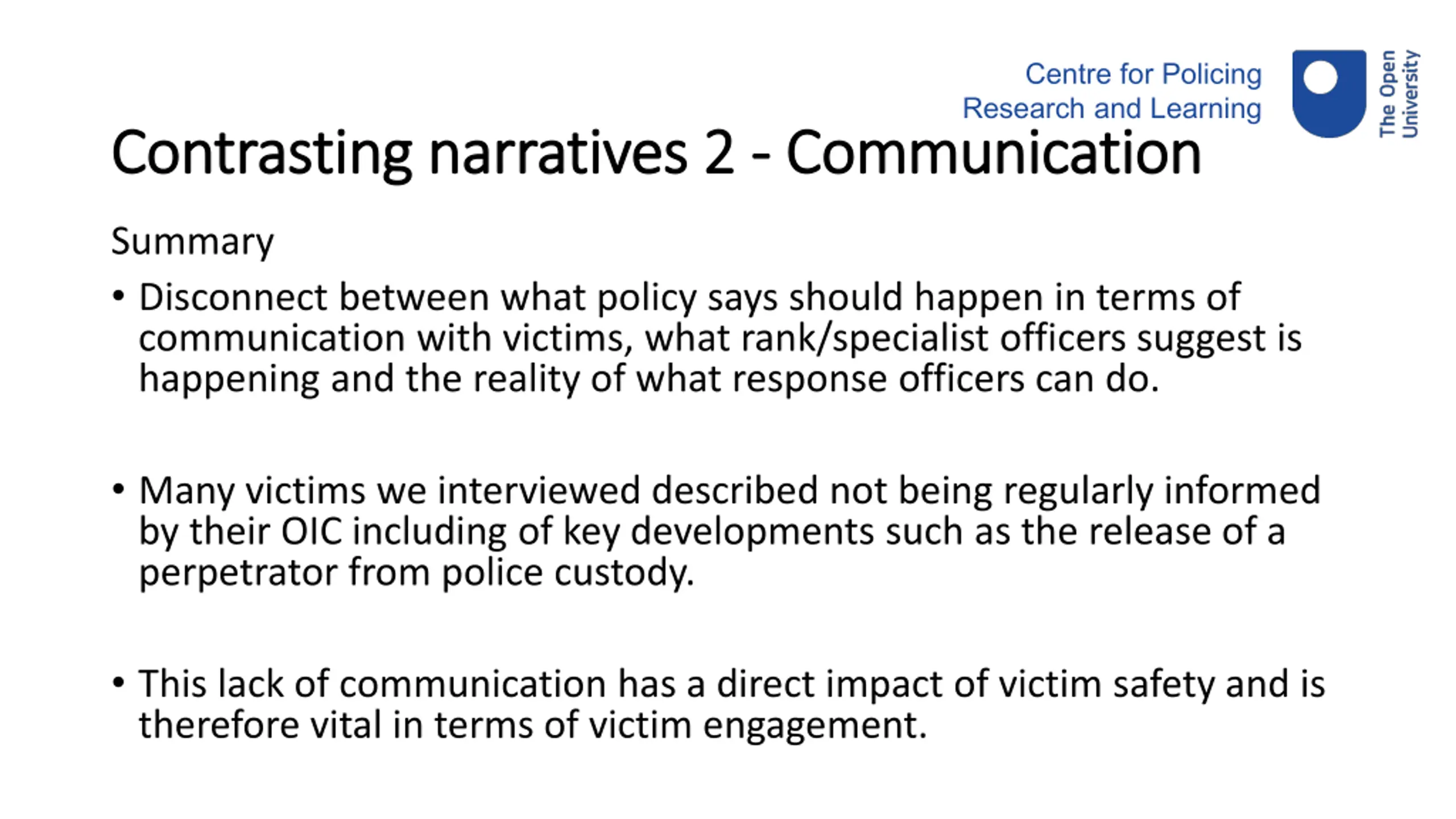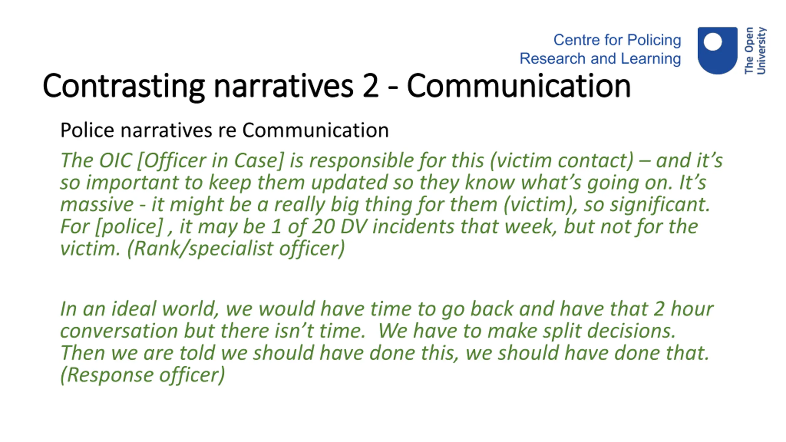 Centre for Policing Research and Learning Contrasting narratives 2 Contrasting narratives 2 - - Communication Communication Summary Disconnect between what policy says should happen in terms of communication with victims, what rank/specialist officers suggest is happening and the reality of what response officers can do. Many victims we interviewed described not being regularly informed by their OIC including of key developments such as the release of a perpetrator from police custody. This lack of communication has a direct impact of victim safety and is therefore vital in terms of victim engagement.