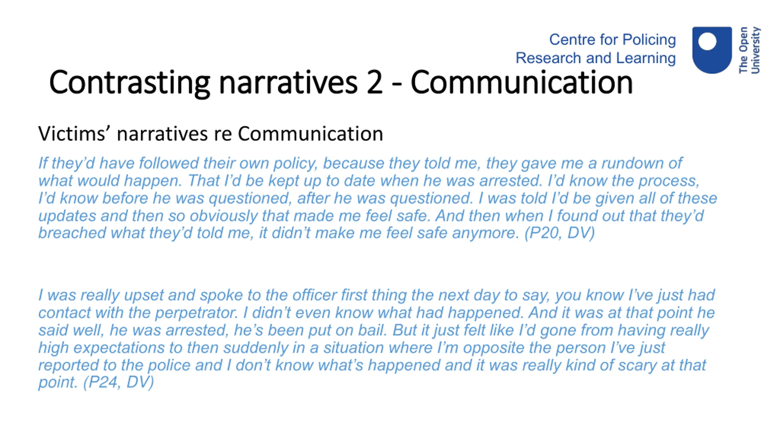Centre for Policing Research and Learning Contrasting narratives 2 Contrasting narratives 2 - - Communication Communication Victims narratives re Communication If they d have followed their own policy, because they told me, they gave me a rundown of what would happen. That I d be kept up to date when he was arrested. I d know the process, I d know before he was questioned, after he was questioned. I was told I d be given all of these updates and then so obviously that made me feel safe. And then when I found out that they d breached what they d told me, it didn t make me feel safe anymore. (P20, DV) I was really upset and spoke to the officer first thing the next day to say, you know I ve just had contact with the perpetrator. I didn t even know what had happened. And it was at that point he said well, he was arrested, he s been put on bail. But it just felt like I d gone from having really high expectations to then suddenly in a situation where I m opposite the person I ve just reported to the police and I don t know what s happened and it was really kind of scary at that point. (P24, DV)