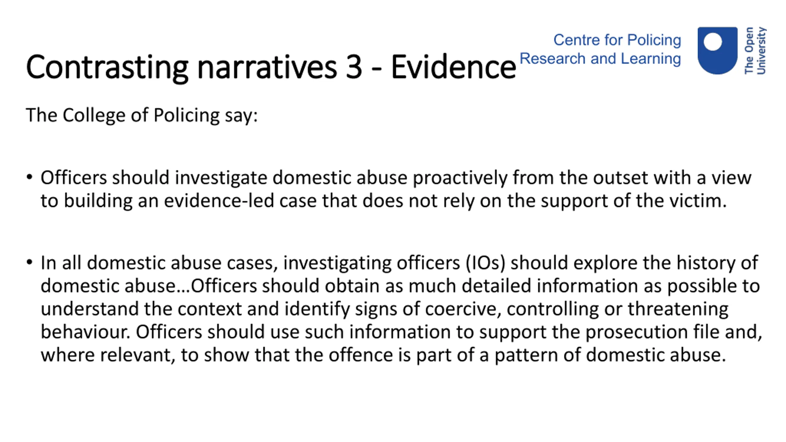 Centre for Policing Research and Learning Contrasting narratives 3 Contrasting narratives 3 - - Evidence Evidence The College of Policing say: Officers should investigate domestic abuse proactively from the outset with a view to building an evidence-led case that does not rely on the support of the victim. In all domestic abuse cases, investigating officers (IOs) should explore the history of domestic abuse Officers should obtain as much detailed information as possible to understand the context and identify signs of coercive, controlling or threatening behaviour. Officers should use such information to support the prosecution file and, where relevant, to show that the offence is part of a pattern of domestic abuse.