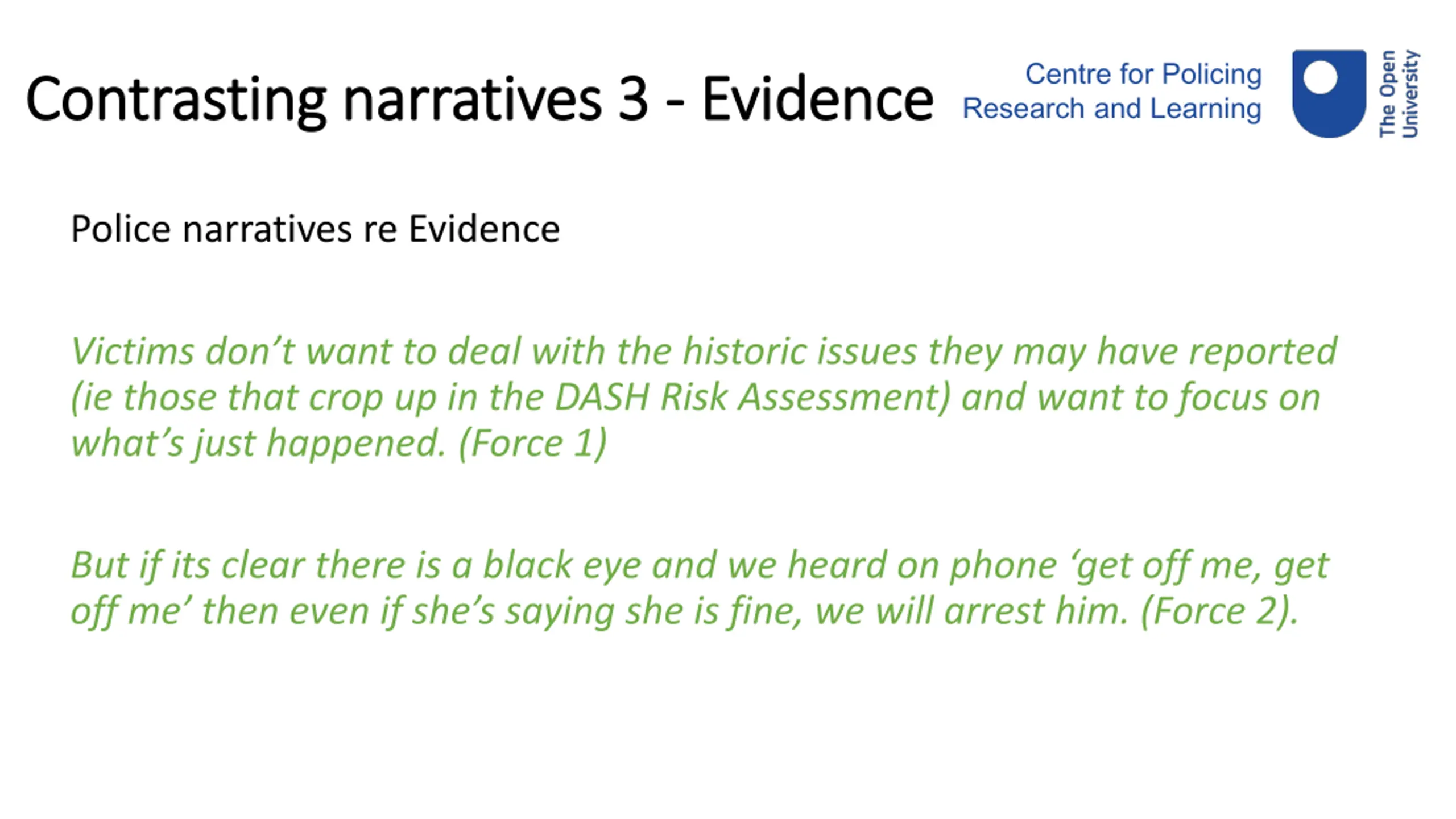 Centre for Policing Research and Learning Contrasting narratives 3 Contrasting narratives 3 - - Evidence Evidence Police narratives re Evidence Victims don t want to deal with the historic issues they may have reported (ie those that crop up in the DASH Risk Assessment) and want to focus on what s just happened. (Force 1) But if its clear there is a black eye and we heard on phone get off me, get off me then even if she s saying she is fine, we will arrest him. (Force 2).