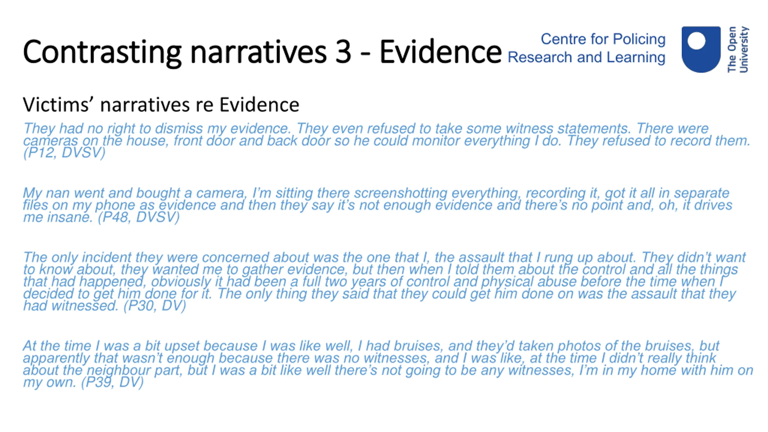Centre for Policing Research and Learning Contrasting narratives 3 Contrasting narratives 3 - - Evidence Evidence Victims narratives re Evidence They had no right to dismiss my evidence. They even refused to take some witness statements. There were cameras on the house, front door and back door so he could monitor everything I do. They refused to record them. (P12, DVSV) My nan went and bought a camera, I m sitting there screenshotting everything, recording it, got it all in separate files on my phone as evidence and then they say it s not enough evidence and there s no point and, oh, it drives me insane. (P48, DVSV) The only incident they were concerned about was the one that I, the assault that I rung up about. They didn t want to know about, they wanted me to gather evidence, but then when I told them about the control and all the things that had happened, obviously it had been a full two years of control and physical abuse before the time when I decided to get him done for it. The only thing they said that they could get him done on was the assault that they had witnessed. (P30, DV) At the time I was a bit upset because I was like well, I had bruises, and they d taken photos of the bruises, but apparently that wasn t enough because there was no witnesses, and I was like, at the time I didn t really think about the neighbour part, but I was a bit like well there s not going to be any witnesses, I m in my home with him on my own. (P39, DV)