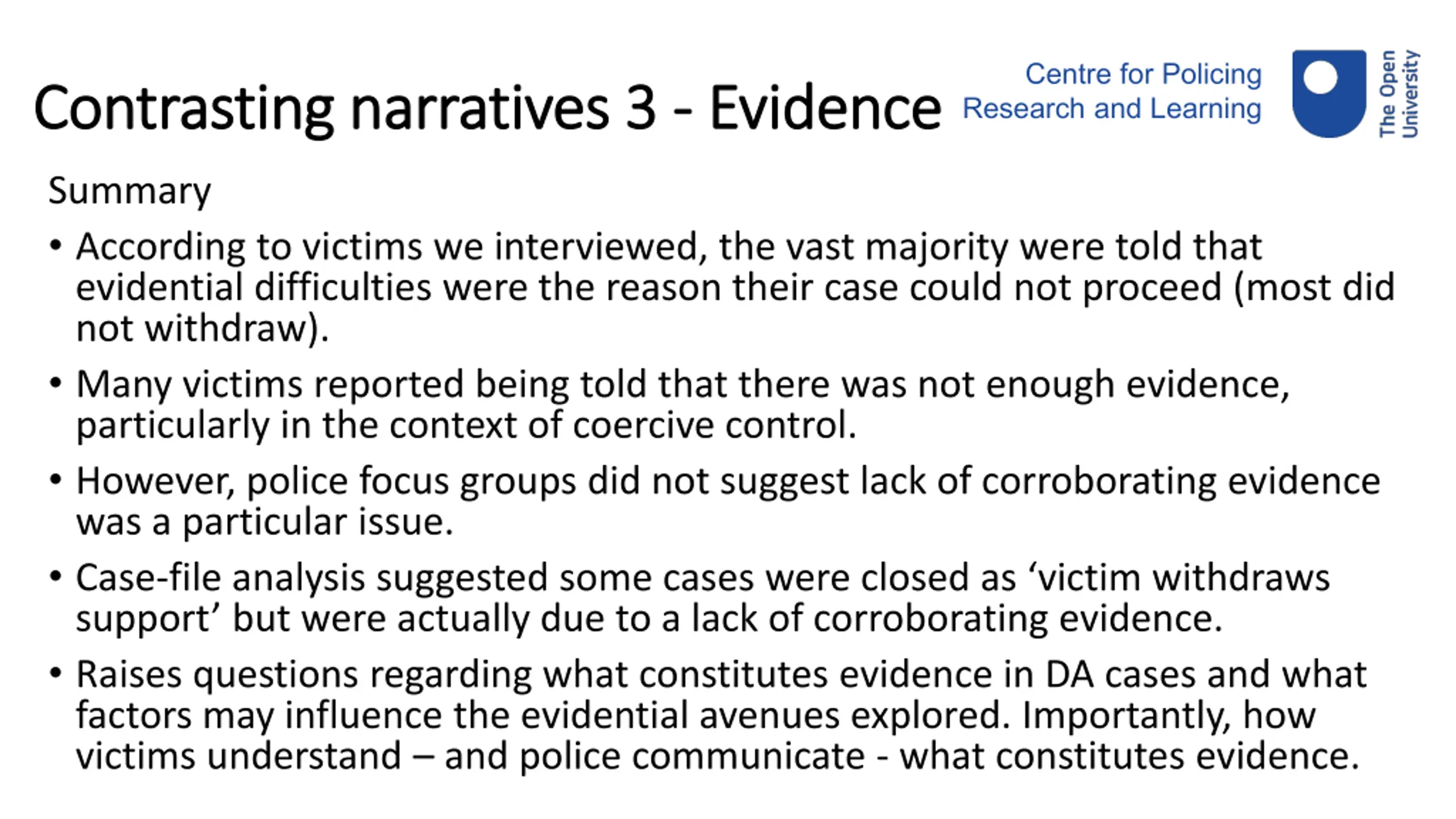 Centre for Policing Research and Learning Contrasting narratives 3 Contrasting narratives 3 - - Evidence Evidence Summary According to victims we interviewed, the vast majority were told that evidential difficulties were the reason their case could not proceed (most did not withdraw). Many victims reported being told that there was not enough evidence, particularly in the context of coercive control. However, police focus groups did not suggest lack of corroborating evidence was a particular issue. Case-file analysis suggested some cases were closed as victim withdraws support but were actually due to a lack of corroborating evidence. Raises questions regarding what constitutes evidence in DA cases and what factors may influence the evidential avenues explored. Importantly, how victims understand and police communicate - what constitutes evidence.