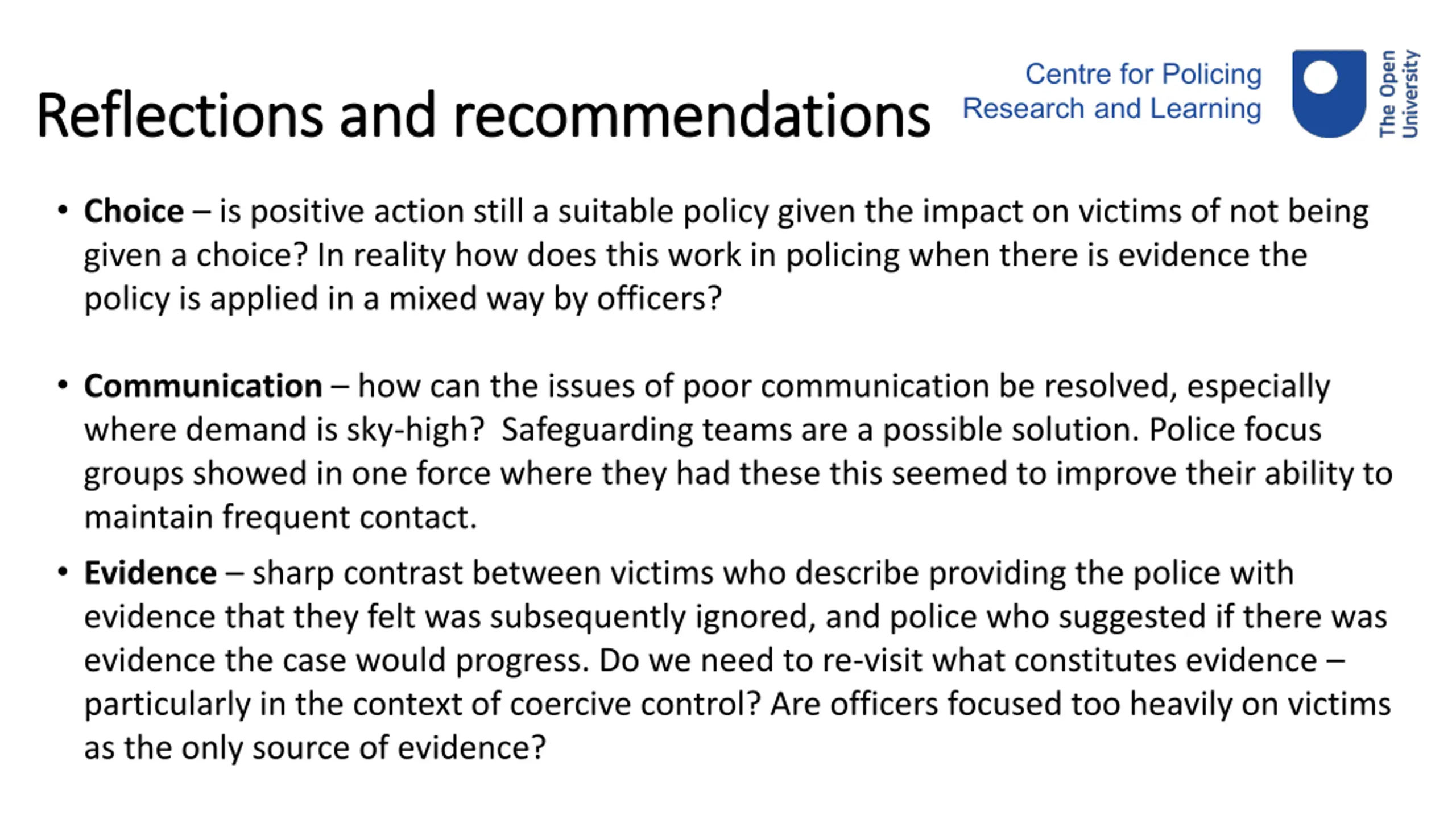 Centre for Policing Research and Learning Reflections and recommendations Reflections and recommendations Choice is positive action still a suitable policy given the impact on victims of not being given a choice? In reality how does this work in policing when there is evidence the policy is applied in a mixed way by officers? Communication how can the issues of poor communication be resolved, especially where demand is sky-high? Safeguarding teams are a possible solution. Police focus groups showed in one force where they had these this seemed to improve their ability to maintain frequent contact. Evidence sharp contrast between victims who describe providing the police with evidence that they felt was subsequently ignored, and police who suggested if there was evidence the case would progress. Do we need to re-visit what constitutes evidence particularly in the context of coercive control? Are officers focused too heavily on victims as the only source of evidence?