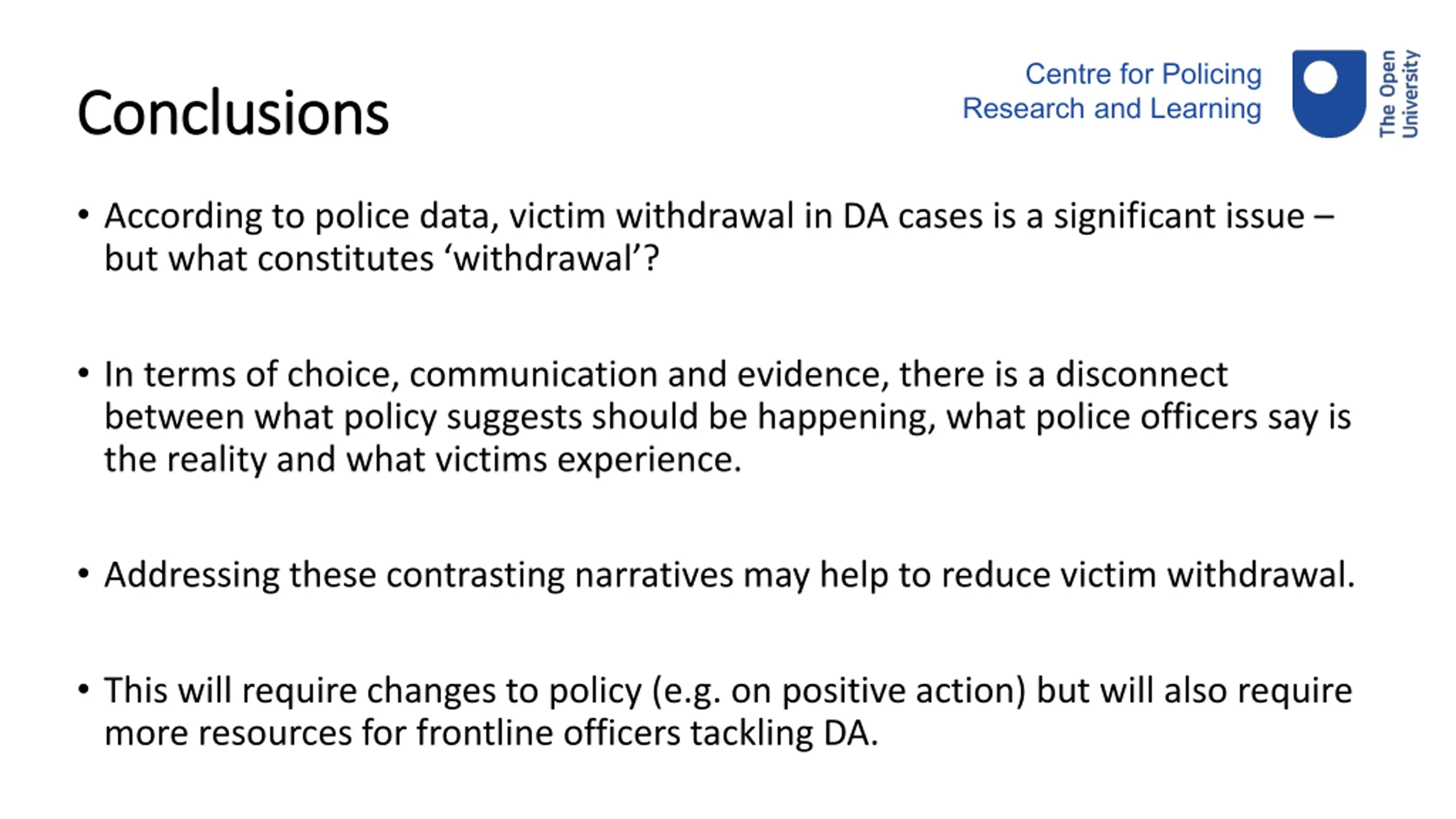 Centre for Policing Research and Learning Conclusions Conclusions According to police data, victim withdrawal in DA cases is a significant issue but what constitutes withdrawal ? In terms of choice, communication and evidence, there is a disconnect between what policy suggests should be happening, what police officers say is the reality and what victims experience. Addressing these contrasting narratives may help to reduce victim withdrawal. This will require changes to policy (e.g. on positive action) but will also require more resources for frontline officers tackling DA.