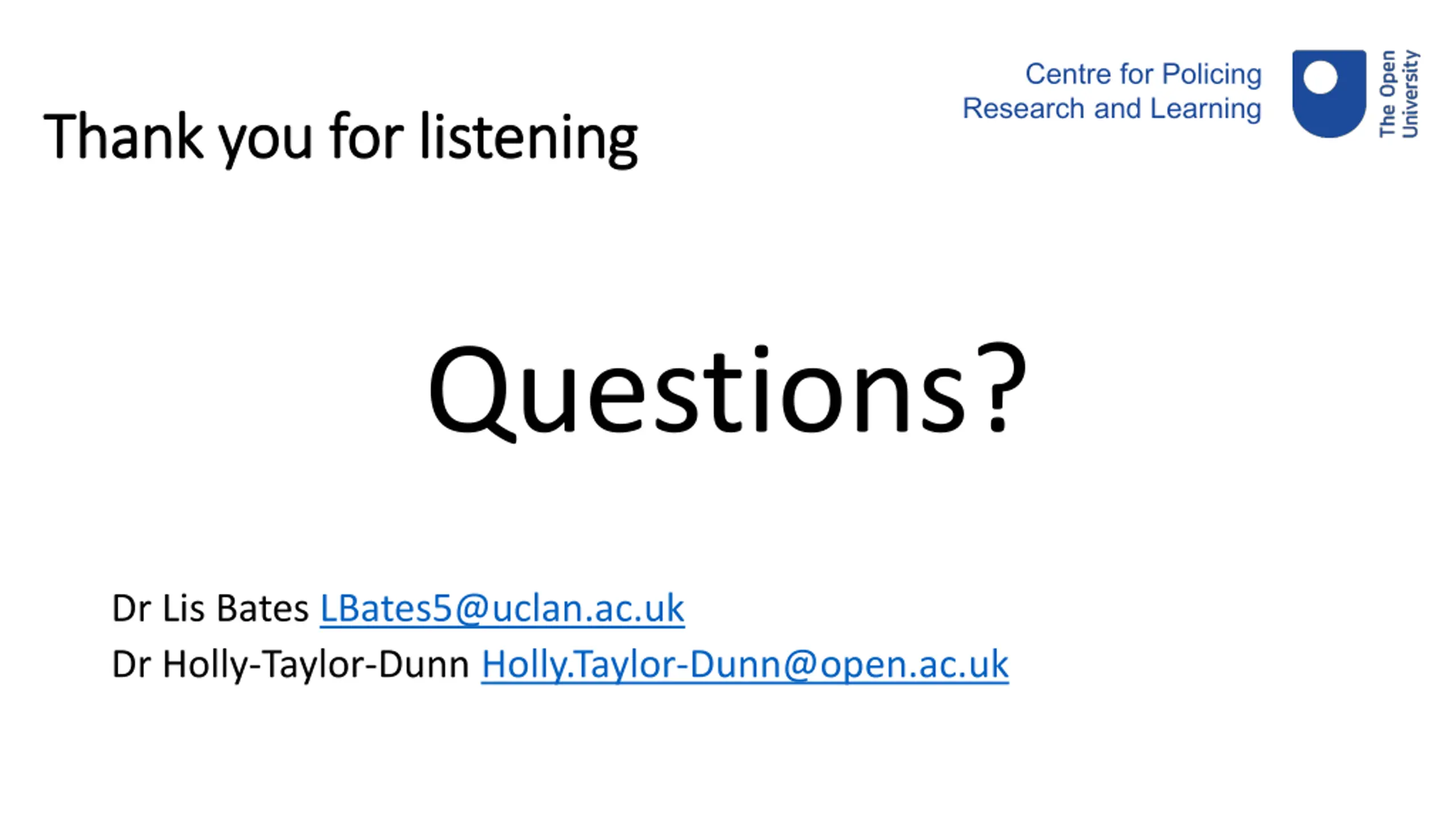 Centre for Policing Research and Learning Thank you for listening Thank you for listening Questions? Dr Lis Bates LBates5@uclan.ac.uk Dr Holly-Taylor-Dunn Holly.Taylor-Dunn@open.ac.uk