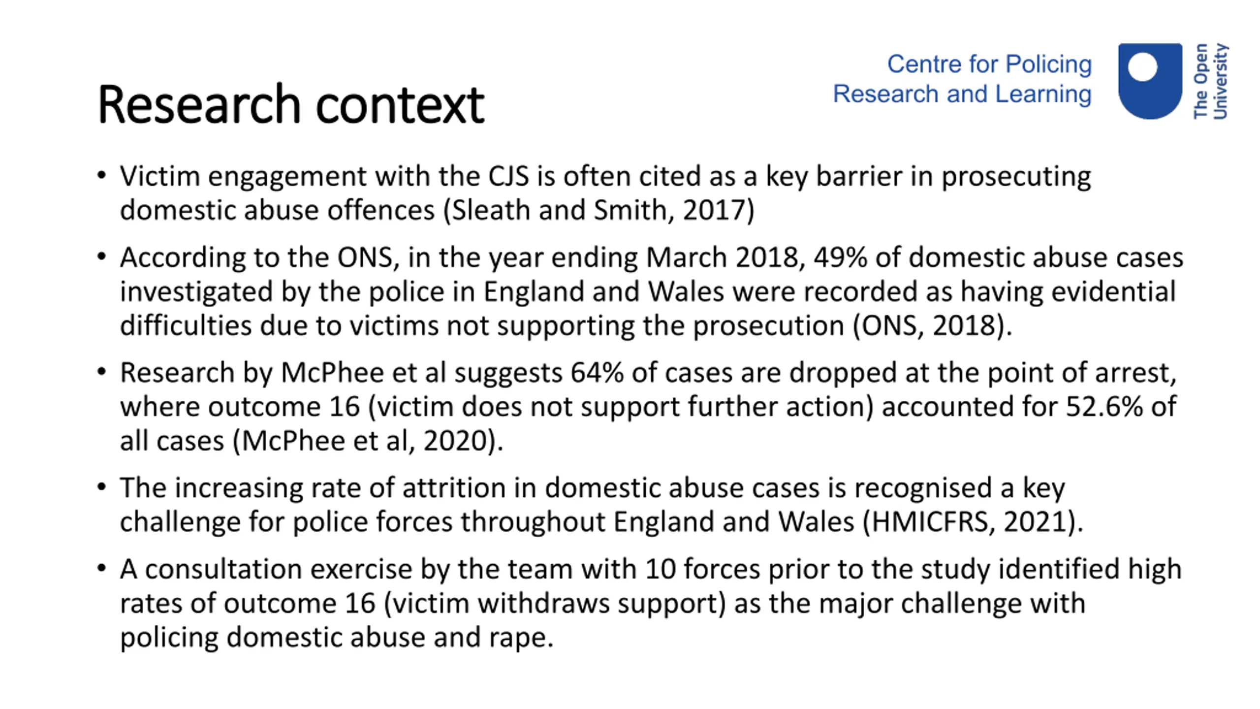 Centre for Policing Research and Learning Research context Research context Victim engagement with the CJS is often cited as a key barrier in prosecuting domestic abuse offences (Sleath and Smith, 2017) According to the ONS, in the year ending March 2018, 49% of domestic abuse cases investigated by the police in England and Wales were recorded as having evidential difficulties due to victims not supporting the prosecution (ONS, 2018). Research by McPhee et al suggests 64% of cases are dropped at the point of arrest, where outcome 16 (victim does not support further action) accounted for 52.6% of all cases (McPhee et al, 2020). The increasing rate of attrition in domestic abuse cases is recognised a key challenge for police forces throughout England and Wales (HMICFRS, 2021). A consultation exercise by the team with 10 forces prior to the study identified high rates of outcome 16 (victim withdraws support) as the major challenge with policing domestic abuse and rape.