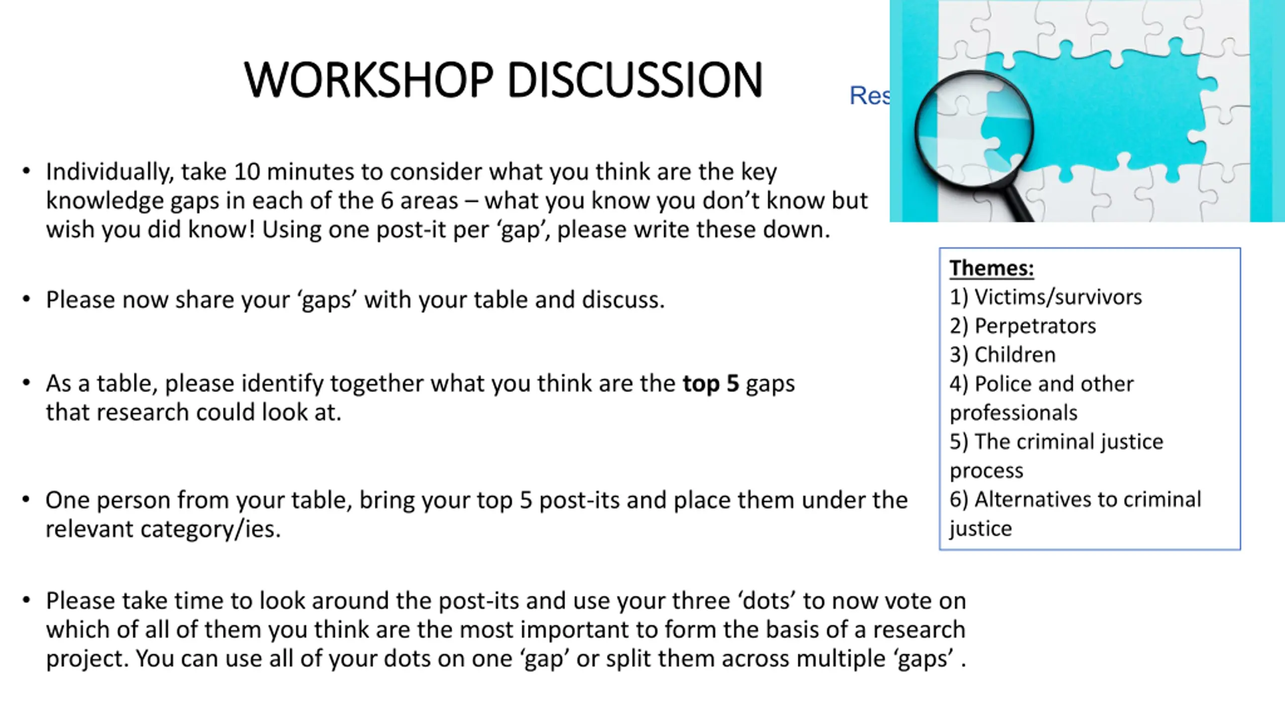 Centre for Policing Research and Learning WORKSHOP DISCUSSION WORKSHOP DISCUSSION Individually, take 10 minutes to consider what you think are the key knowledge gaps in each of the 6 areas what you know you don t know but wish you did know! Using one post-it per gap , please write these down. Themes: 1) Victims/survivors 2) Perpetrators 3) Children 4) Police and other professionals 5) The criminal justice process 6) Alternatives to criminal justice Please now share your gaps with your table and discuss. As a table, please identify together what you think are the top 5 gaps that research could look at. One person from your table, bring your top 5 post-its and place them under the relevant category/ies. Please take time to look around the post-its and use your three dots to now vote on which of all of them you think are the most important to form the basis of a research project. You can use all of your dots on one gap or split them across multiple gaps .