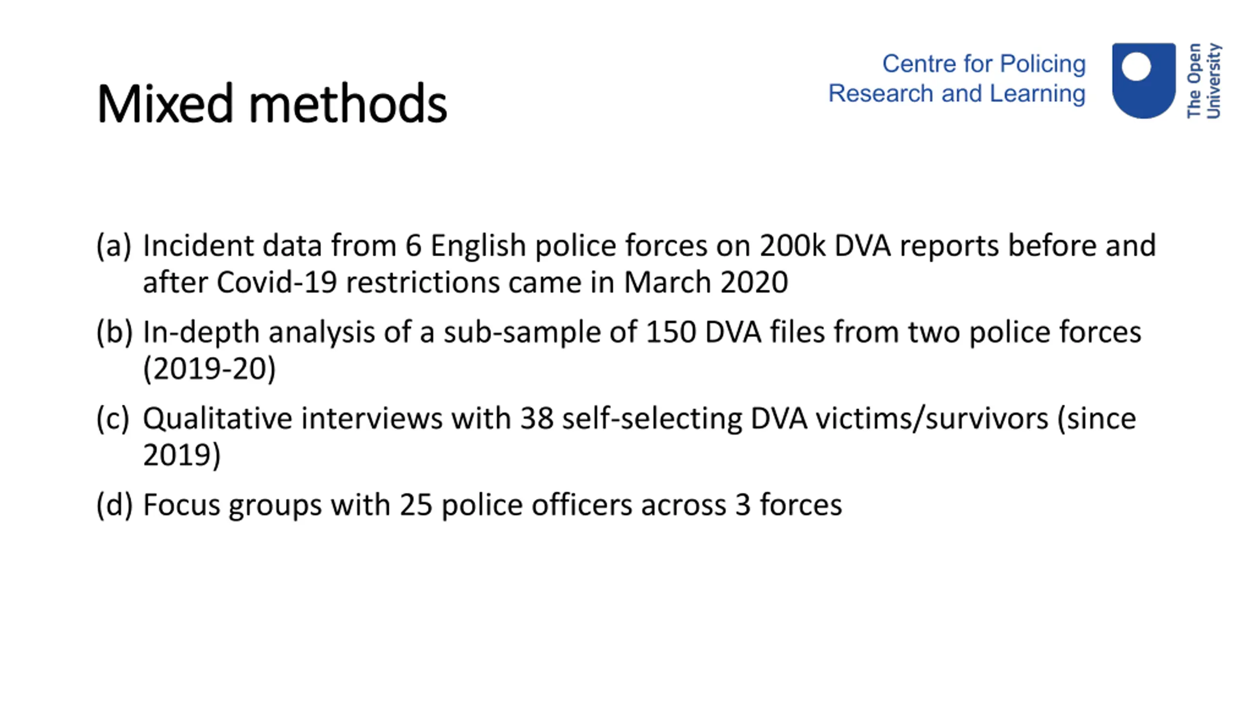 Centre for Policing Research and Learning Mixed methods Mixed methods (a) Incident data from 6 English police forces on 200k DVA reports before and after Covid-19 restrictions came in March 2020 (b) In-depth analysis of a sub-sample of 150 DVA files from two police forces (2019-20) (c) Qualitative interviews with 38 self-selecting DVA victims/survivors (since 2019) (d) Focus groups with 25 police officers across 3 forces