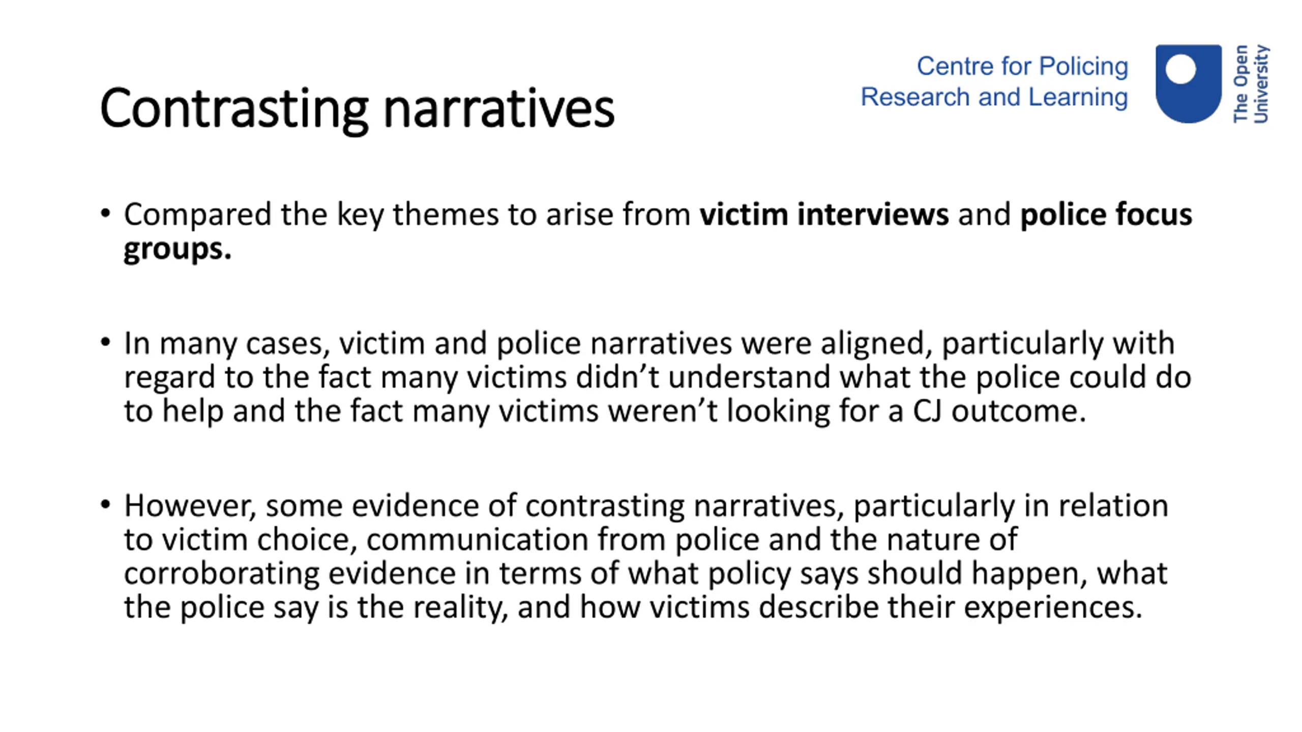 Centre for Policing Research and Learning Contrasting narratives Contrasting narratives Compared the key themes to arise from victim interviews and police focus groups. In many cases, victim and police narratives were aligned, particularly with regard to the fact many victims didn t understand what the police could do to help and the fact many victims weren t looking for a CJ outcome. However, some evidence of contrasting narratives, particularly in relation to victim choice, communication from police and the nature of corroborating evidence in terms of what policy says should happen, what the police say is the reality, and how victims describe their experiences.