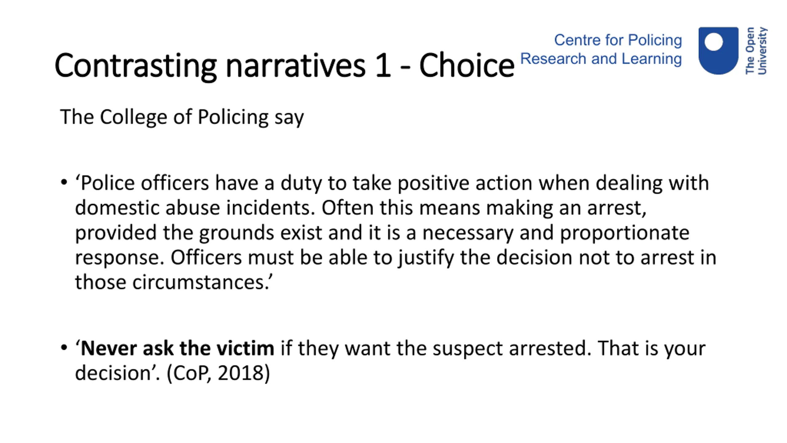 Centre for Policing Research and Learning Contrasting narratives 1 Contrasting narratives 1 - - Choice Choice The College of Policing say Police officers have a duty to take positive action when dealing with domestic abuse incidents. Often this means making an arrest, provided the grounds exist and it is a necessary and proportionate response. Officers must be able to justify the decision not to arrest in those circumstances. Never ask the victim if they want the suspect arrested. That is your decision . (CoP, 2018)