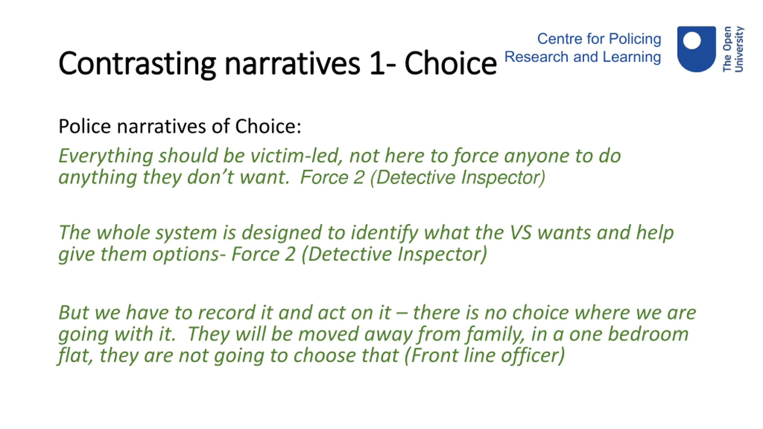 Centre for Policing Research and Learning Contrasting narratives 1 Contrasting narratives 1- - Choice Choice Police narratives of Choice: Everything should be victim-led, not here to force anyone to do anything they don t want.Force 2 (Detective Inspector) The whole system is designed to identify what the VS wants and help give them options- Force 2 (Detective Inspector) But we have to record it and act on it there is no choice where we are going with it. They will be moved away from family, in a one bedroom flat, they are not going to choose that (Front line officer)