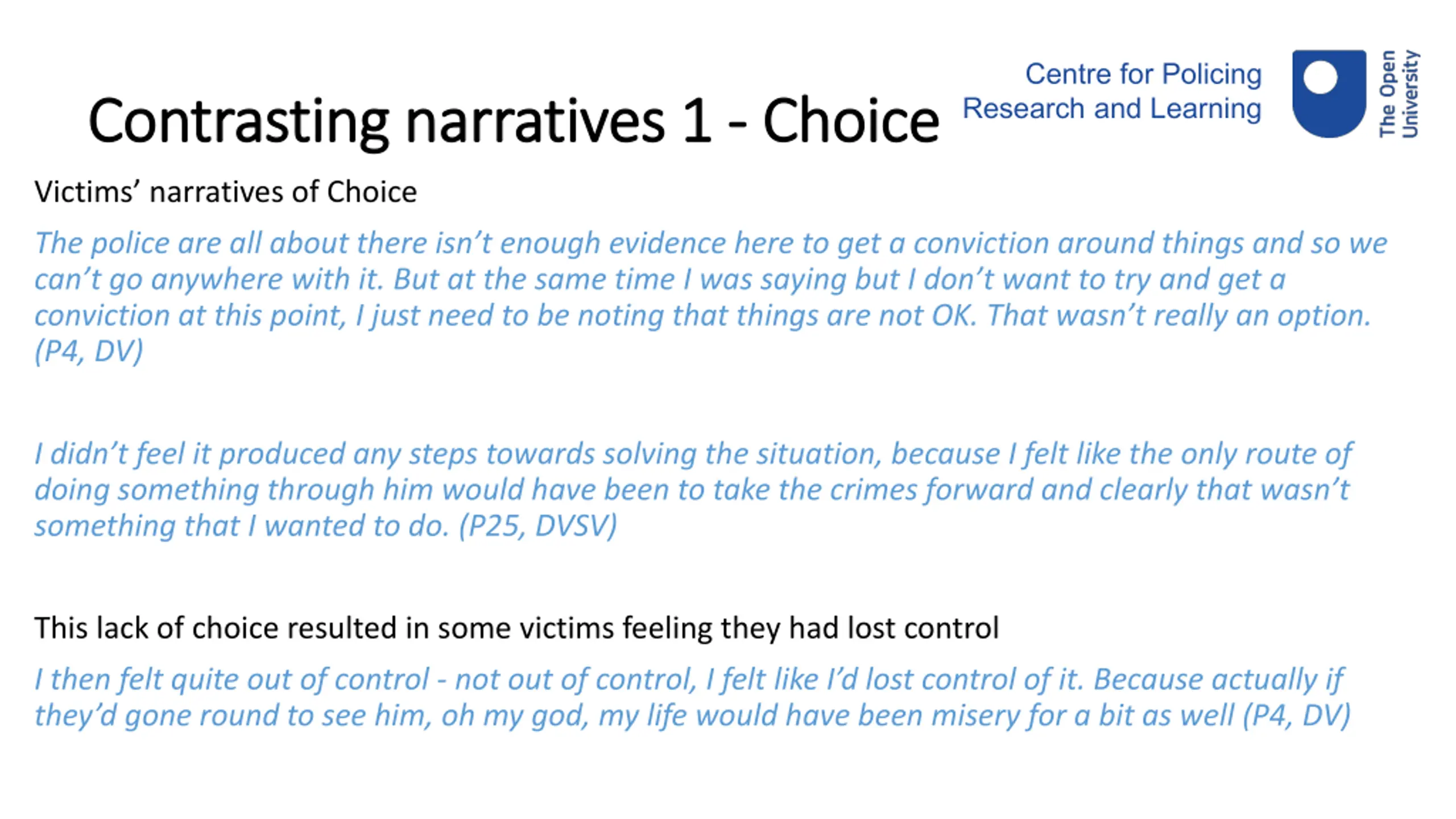 Centre for Policing Research and Learning Contrasting narratives 1 Contrasting narratives 1 - - Choice Choice Victims narratives of Choice The police are all about there isn t enough evidence here to get a conviction around things and so we can t go anywhere with it. But at the same time I was saying but I don t want to try and get a conviction at this point, I just need to be noting that things are not OK. That wasn t really an option. (P4, DV) I didn t feel it produced any steps towards solving the situation, because I felt like the only route of doing something through him would have been to take the crimes forward and clearly that wasn t something that I wanted to do. (P25, DVSV) This lack of choice resulted in some victims feeling they had lost control I then felt quite out of control - not out of control, I felt like I d lost control of it. Because actually if they d gone round to see him, oh my god, my life would have been misery for a bit as well (P4, DV)