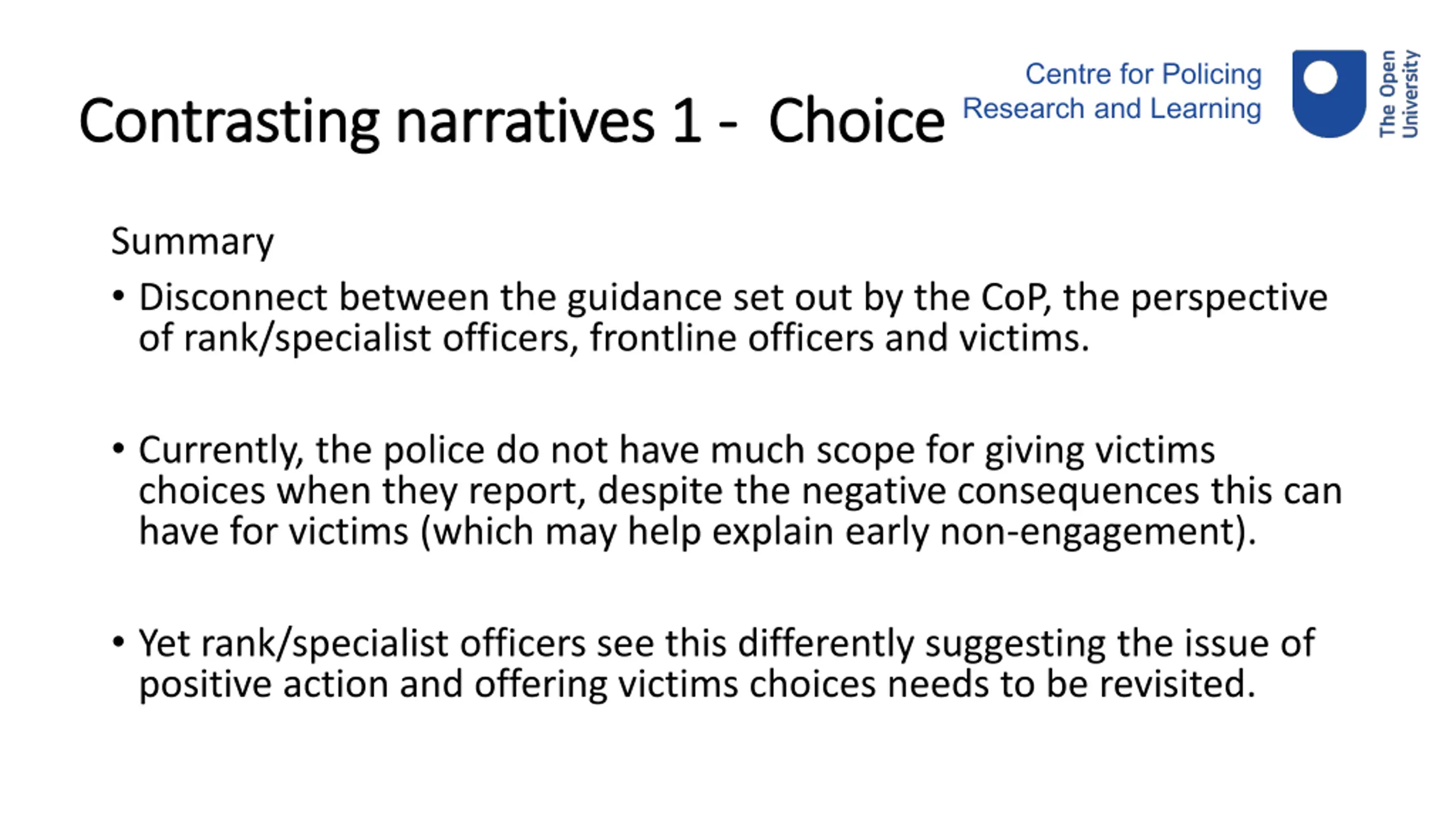 Centre for Policing Research and Learning Contrasting narratives 1 Contrasting narratives 1 - - Choice Choice Summary Disconnect between the guidance set out by the CoP, the perspective of rank/specialist officers, frontline officers and victims. Currently, the police do not have much scope for giving victims choices when they report, despite the negative consequences this can have for victims (which may help explain early non-engagement). Yet rank/specialist officers see this differently suggesting the issue of positive action and offering victims choices needs to be revisited.