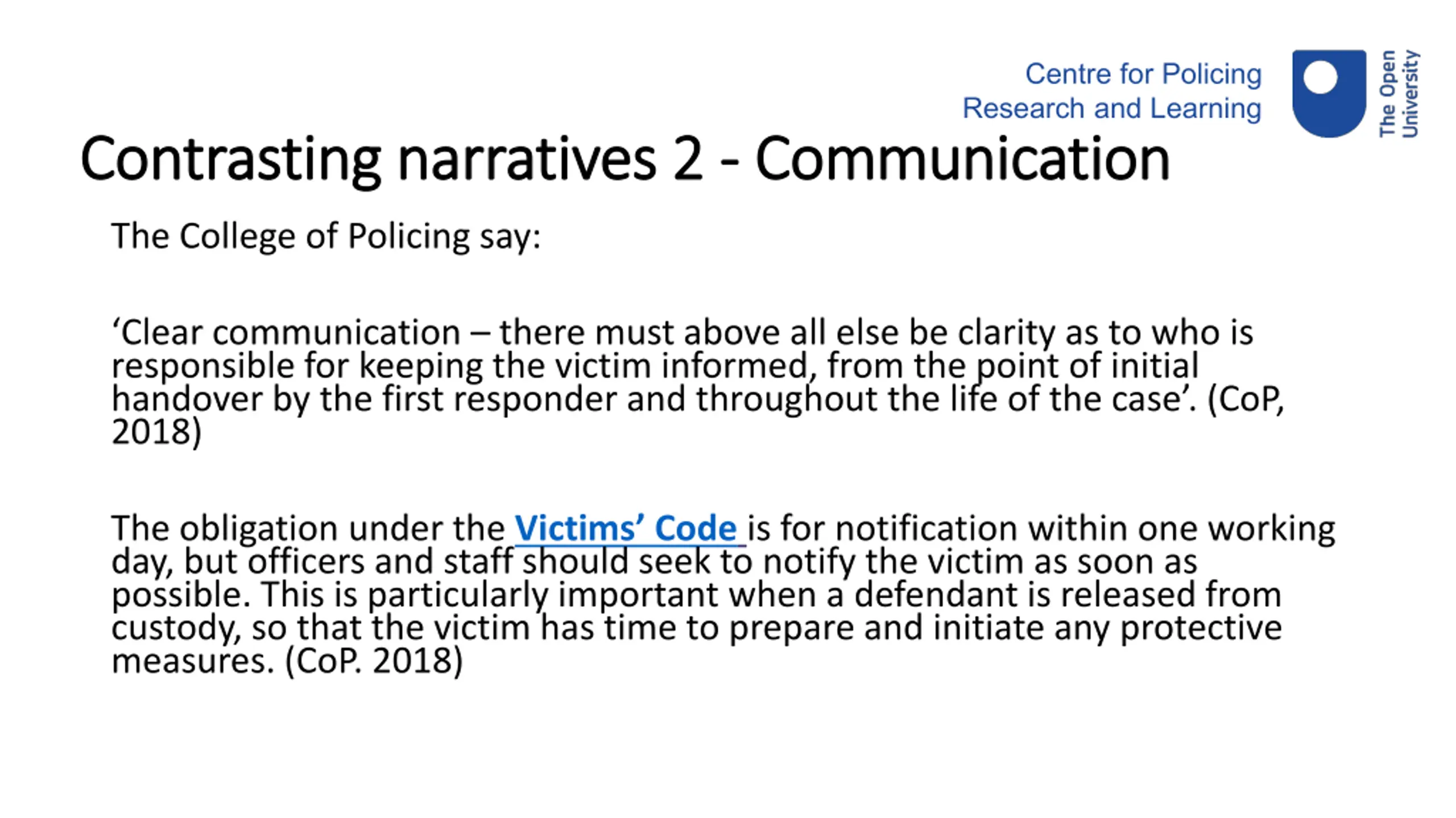 Centre for Policing Research and Learning Contrasting narratives 2 Contrasting narratives 2 - - Communication Communication The College of Policing say: Clear communication there must above all else be clarity as to who is responsible for keeping the victim informed, from the point of initial handover by the first responder and throughout the life of the case . (CoP, 2018) The obligation under the Victims Code is for notification within one working day, but officers and staff should seek to notify the victim as soon as possible. This is particularly important when a defendant is released from custody, so that the victim has time to prepare and initiate any protective measures. (CoP. 2018)