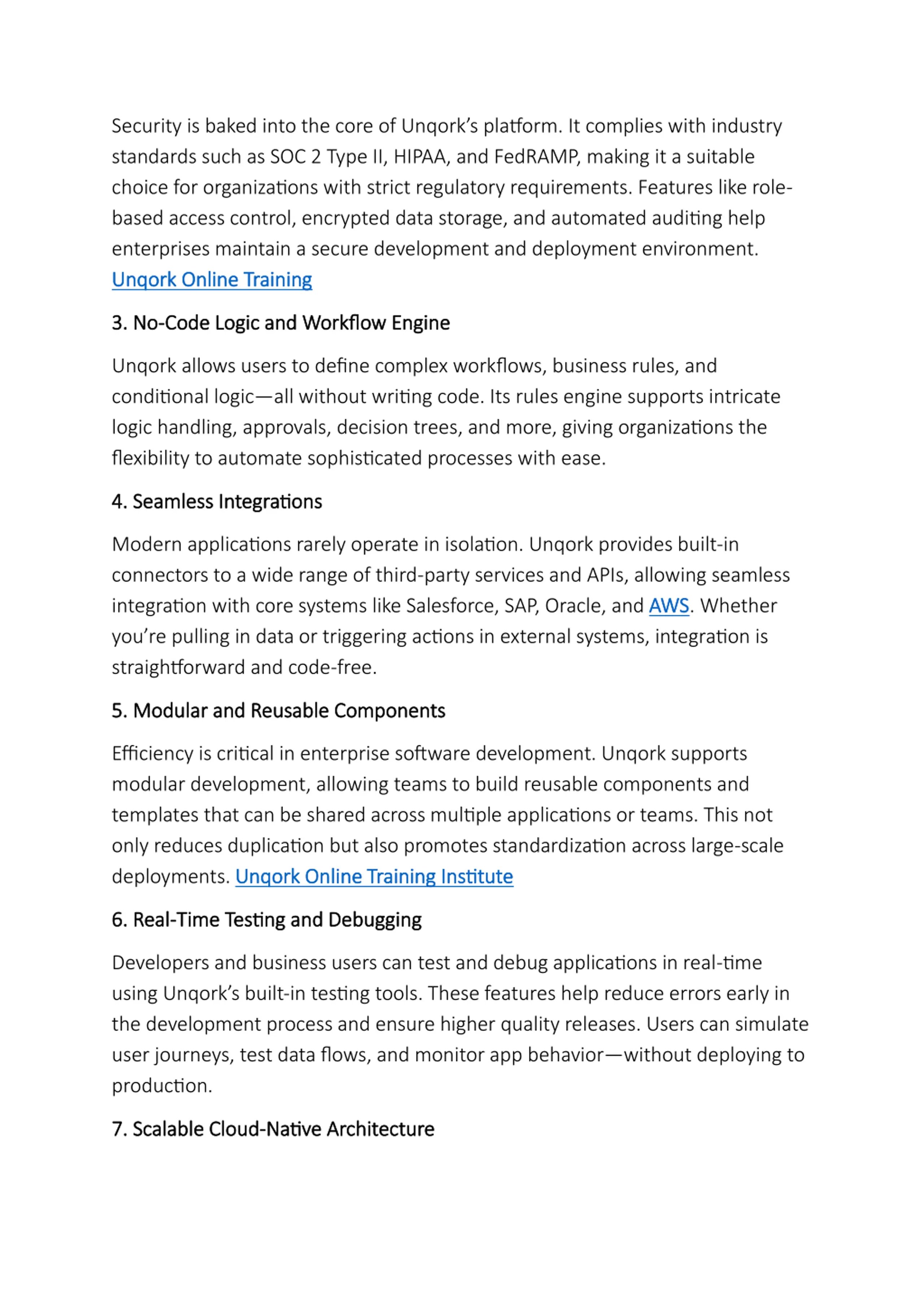 Security is baked into the core of Unqorks platform. It complies with industry standards such as SOC 2 Type II, HIPAA, and FedRAMP, making it a suitable choice for organizations with strict regulatory requirements. Features like role- based access control, encrypted data storage, and automated auditing help enterprises maintain a secure development and deployment environment. Unqork Online Training Unqork Online Training 3. No 3. No- -Code Logic and Workflow Engine Code Logic and Workflow Engine Unqork allows users to define complex workflows, business rules, and conditional logic all without writing code. Its rules engine supports intricate logic handling, approvals, decision trees, and more, giving organizations the flexibility to automate sophisticated processes with ease. 4. Seamless Integrations 4. Seamless Integrations Modern applications rarely operate in isolation. Unqork provides built-in connectors to a wide range of third-party services and APIs, allowing seamless integration with core systems like Salesforce, SAP, Oracle, and AWS you re pulling in data or triggering actions in external systems, integration is straightforward and code-free. AWS. Whether 5. Modular and Reusable Components 5. Modular and Reusable Components Efficiency is critical in enterprise software development. Unqork supports modular development, allowing teams to build reusable components and templates that can be shared across multiple applications or teams. This not only reduces duplication but also promotes standardization across large-scale deployments.Unqork Online Training Institute Unqork Online Training Institute 6. Real 6. Real- -Time Testing and Debugging Time Testing and Debugging Developers and business users can test and debug applications in real-time using Unqork s built-in testing tools. These features help reduce errors early in the development process and ensure higher quality releases. Users can simulate user journeys, test data flows, and monitor app behavior without deploying to production. 7. Scalable Cloud 7. Scalable Cloud- -Native Architecture Native Architecture
