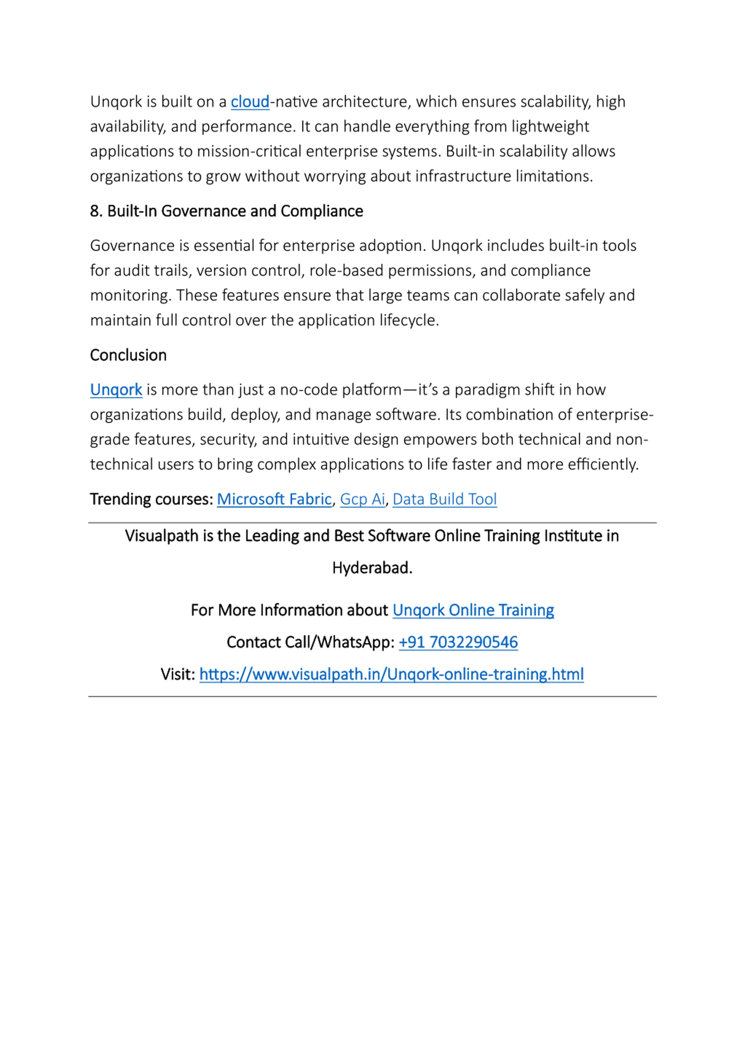 Unqork is built on a cloud availability, and performance. It can handle everything from lightweight applications to mission-critical enterprise systems. Built-in scalability allows organizations to grow without worrying about infrastructure limitations. cloud-native architecture, which ensures scalability, high 8. Built 8. Built- -In Governance and Compliance In Governance and Compliance Governance is essential for enterprise adoption. Unqork includes built-in tools for audit trails, version control, role-based permissions, and compliance monitoring. These features ensure that large teams can collaborate safely and maintain full control over the application lifecycle. Conclusion Conclusion Unqork Unqork is more than just a no-code platform it s a paradigm shift in how organizations build, deploy, and manage software. Its combination of enterprise- grade features, security, and intuitive design empowers both technical and non- technical users to bring complex applications to life faster and more efficiently. Trending courses: Trending courses:Microsoft Fabric, Gcp Ai, Data Build Tool Visualpath is the Leading and Best Software Online Training Institute in Visualpath is the Leading and Best Software Online Training Institute in Hyderabad. Hyderabad. For More Information about For More Information about Unqork Online Training Unqork Online Training Contact Call/WhatsApp: Contact Call/WhatsApp: +91 7032290546 +91 7032290546 Visit: Visit: https://www.visualpath.in/Unqork https://www.visualpath.in/Unqork- -online online- -training.html training.html