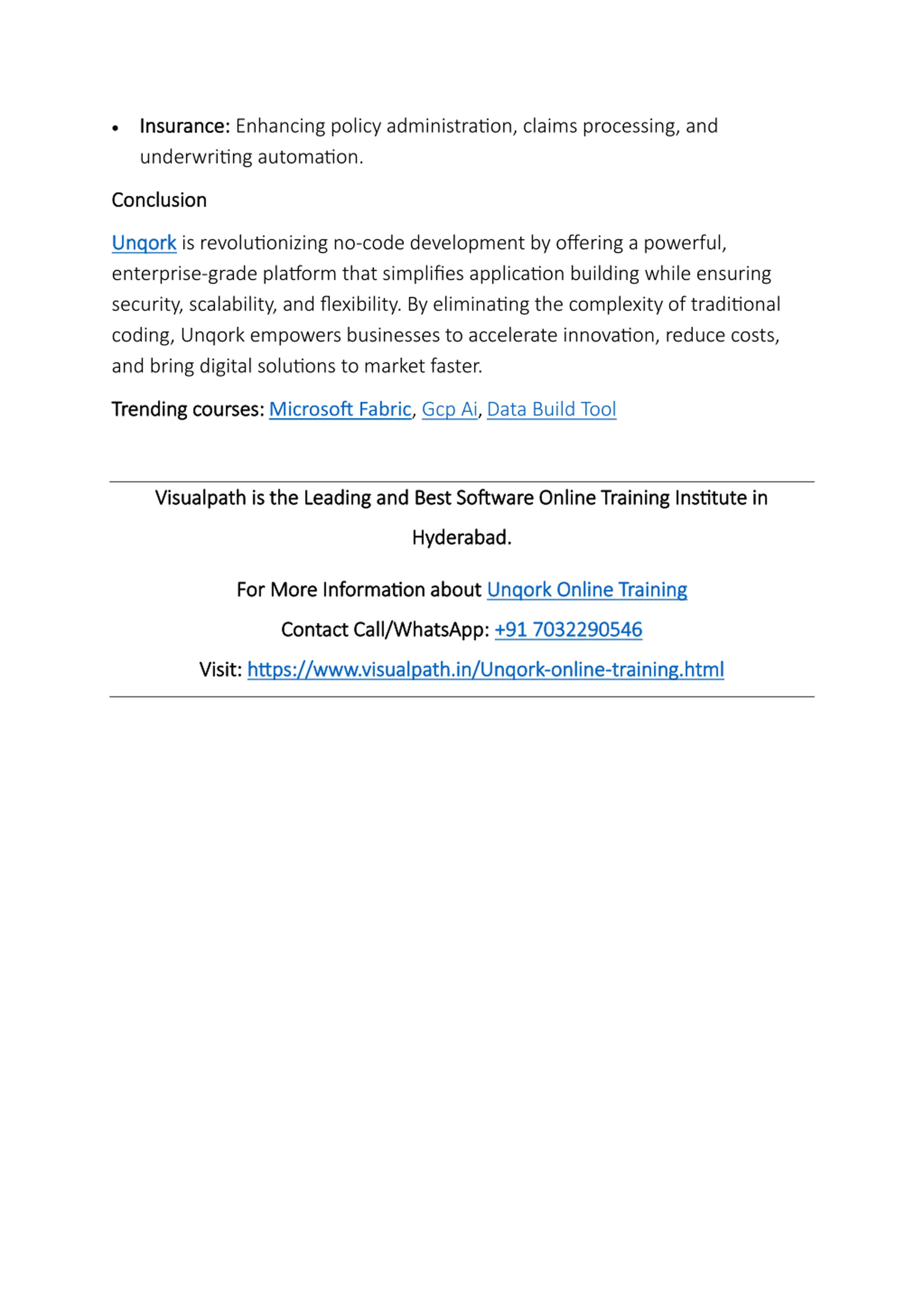 Insurance: Insurance: Enhancing policy administration, claims processing, and underwriting automation. Conclusion Conclusion Unqork Unqork is revolutionizing no-code development by offering a powerful, enterprise-grade platform that simplifies application building while ensuring security, scalability, and flexibility. By eliminating the complexity of traditional coding, Unqork empowers businesses to accelerate innovation, reduce costs, and bring digital solutions to market faster. Trending courses: Trending courses:Microsoft Fabric, Gcp Ai, Data Build Tool Visualpath is the Leading and Best Software Online Training Institute in Visualpath is the Leading and Best Software Online Training Institute in Hyderabad. Hyderabad. For More Information about For More Information about Unqork Online Training Unqork Online Training Contact Call/WhatsApp: Contact Call/WhatsApp: +91 7032290546 +91 7032290546 Visit: Visit: https://www.visualpath.in/Unqork https://www.visualpath.in/Unqork- -online online- -training.html training.html