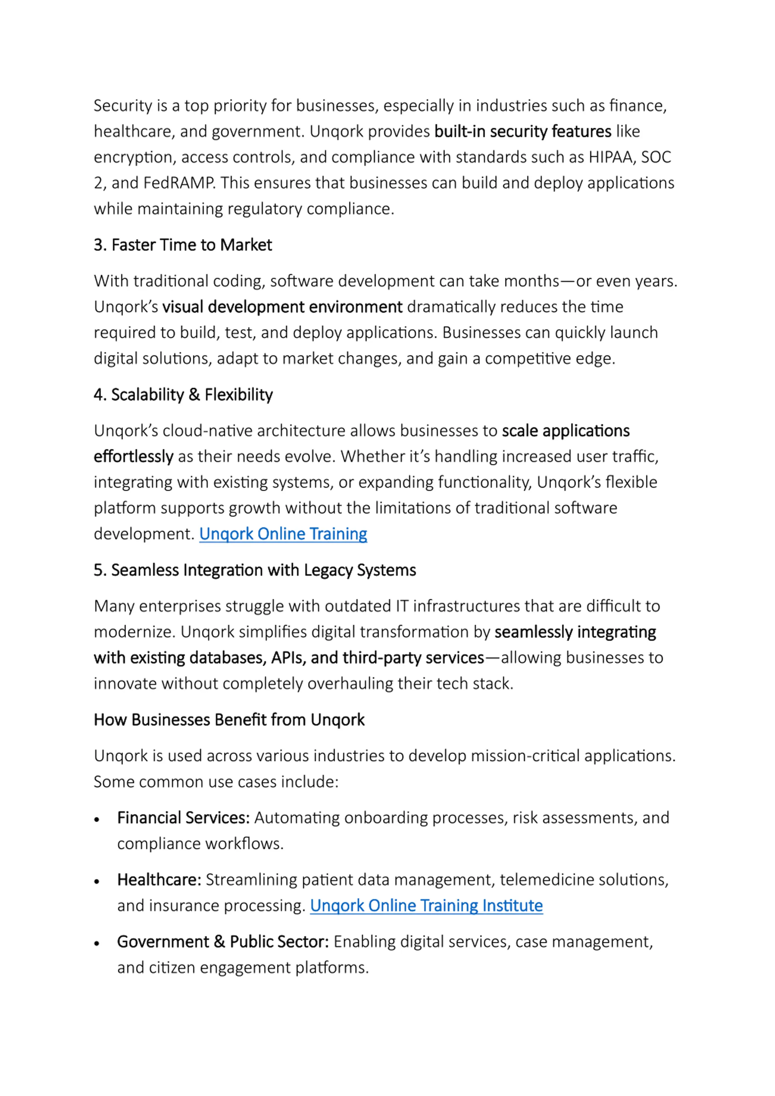 Security is a top priority for businesses, especially in industries such as finance, healthcare, and government. Unqork provides built encryption, access controls, and compliance with standards such as HIPAA, SOC 2, and FedRAMP. This ensures that businesses can build and deploy applications while maintaining regulatory compliance. built- -in security features in security features like 3. Faster Time to Market 3. Faster Time to Market With traditional coding, software development can take months or even years. Unqork s visual development environment visual development environment dramatically reduces the time required to build, test, and deploy applications. Businesses can quickly launch digital solutions, adapt to market changes, and gain a competitive edge. 4. Scalability & Flexibility 4. Scalability & Flexibility Unqork s cloud-native architecture allows businesses to scale applications effortlessly effortlessly as their needs evolve. Whether it s handling increased user traffic, integrating with existing systems, or expanding functionality, Unqork s flexible platform supports growth without the limitations of traditional software development.Unqork Online Training Unqork Online Training scale applications 5. Seamless Integration with Legacy Systems 5. Seamless Integration with Legacy Systems Many enterprises struggle with outdated IT infrastructures that are difficult to modernize. Unqork simplifies digital transformation by seamlessly integrating with existing databases, APIs, and third with existing databases, APIs, and third- -party services innovate without completely overhauling their tech stack. seamlessly integrating party services allowing businesses to How Businesses Benefit from Unqork How Businesses Benefit from Unqork Unqork is used across various industries to develop mission-critical applications. Some common use cases include: Financial Services: Financial Services: Automating onboarding processes, risk assessments, and compliance workflows. Healthcare: Healthcare: Streamlining patient data management, telemedicine solutions, and insurance processing.Unqork Online Training Institute Unqork Online Training Institute Government & Public Sector: Government & Public Sector: Enabling digital services, case management, and citizen engagement platforms.