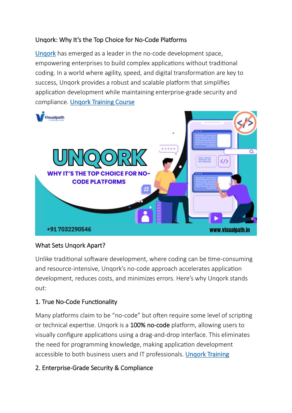Unqork: Why Its the Top Choice for No Unqork: Why It s the Top Choice for No- -Code Platforms Code Platforms Unqork Unqork has emerged as a leader in the no-code development space, empowering enterprises to build complex applications without traditional coding. In a world where agility, speed, and digital transformation are key to success, Unqork provides a robust and scalable platform that simplifies application development while maintaining enterprise-grade security and compliance.Unqork Training Course Unqork Training Course What Sets Unqork Apart? What Sets Unqork Apart? Unlike traditional software development, where coding can be time-consuming and resource-intensive, Unqork s no-code approach accelerates application development, reduces costs, and minimizes errors. Here s why Unqork stands out: 1. True No 1. True No- -Code Functionality Code Functionality Many platforms claim to be no-code but often require some level of scripting or technical expertise. Unqork is a 100% no 100% no- -code visually configure applications using a drag-and-drop interface. This eliminates the need for programming knowledge, making application development accessible to both business users and IT professionals.Unqork Training code platform, allowing users to Unqork Training 2. Enterprise 2. Enterprise- -Grade Security & Compliance Grade Security & Compliance
