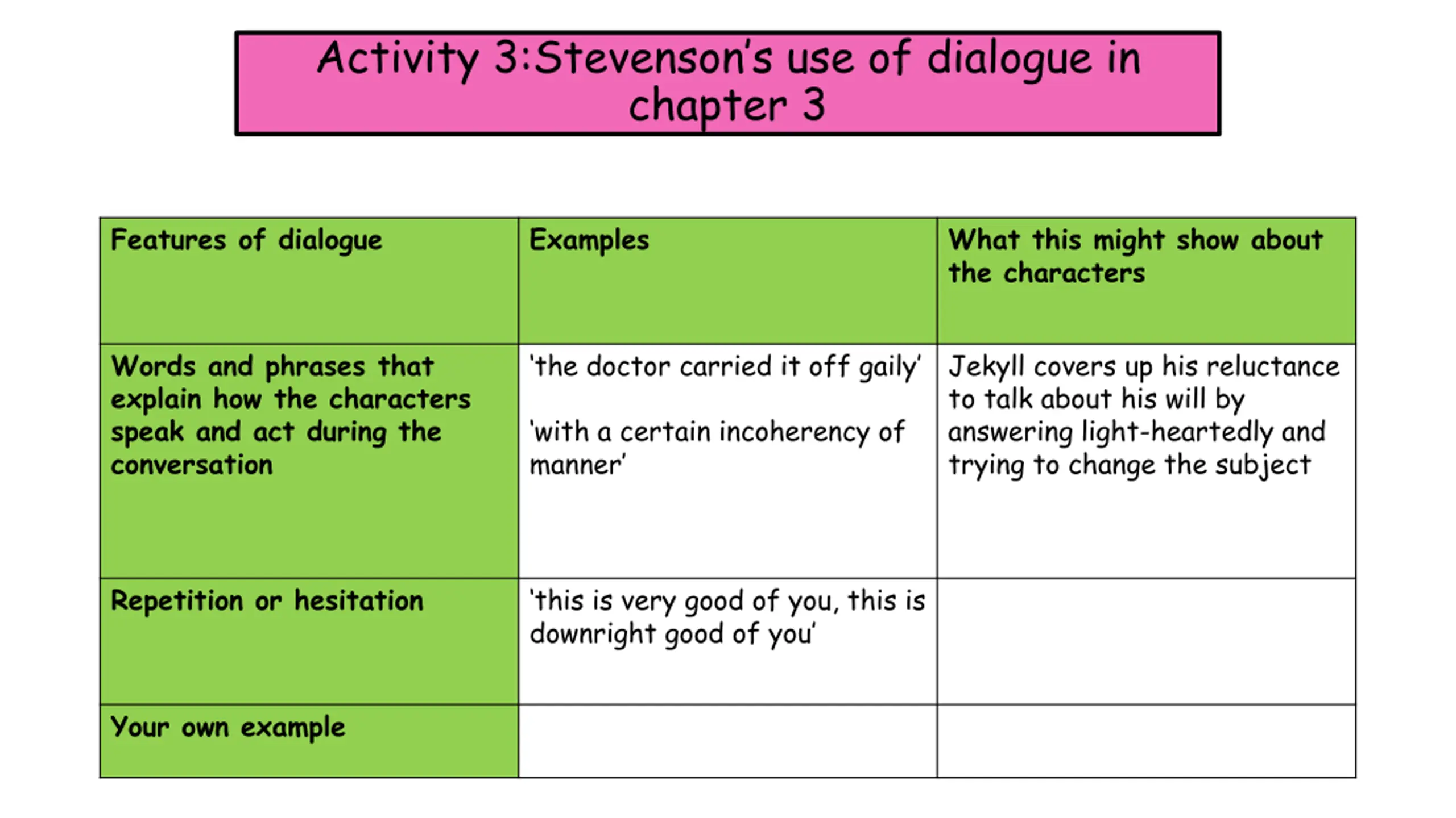 Activity 3:Stevensons use of dialogue in chapter 3 Features of dialogue Examples What this might show about the characters Words and phrases that explain how the characters speak and act during the conversation the doctor carried it off gaily Jekyll covers up his reluctance to talk about his will by answering light-heartedly and trying to change the subject with a certain incoherency of manner Repetition or hesitation this is very good of you, this is downright good of you Your own example