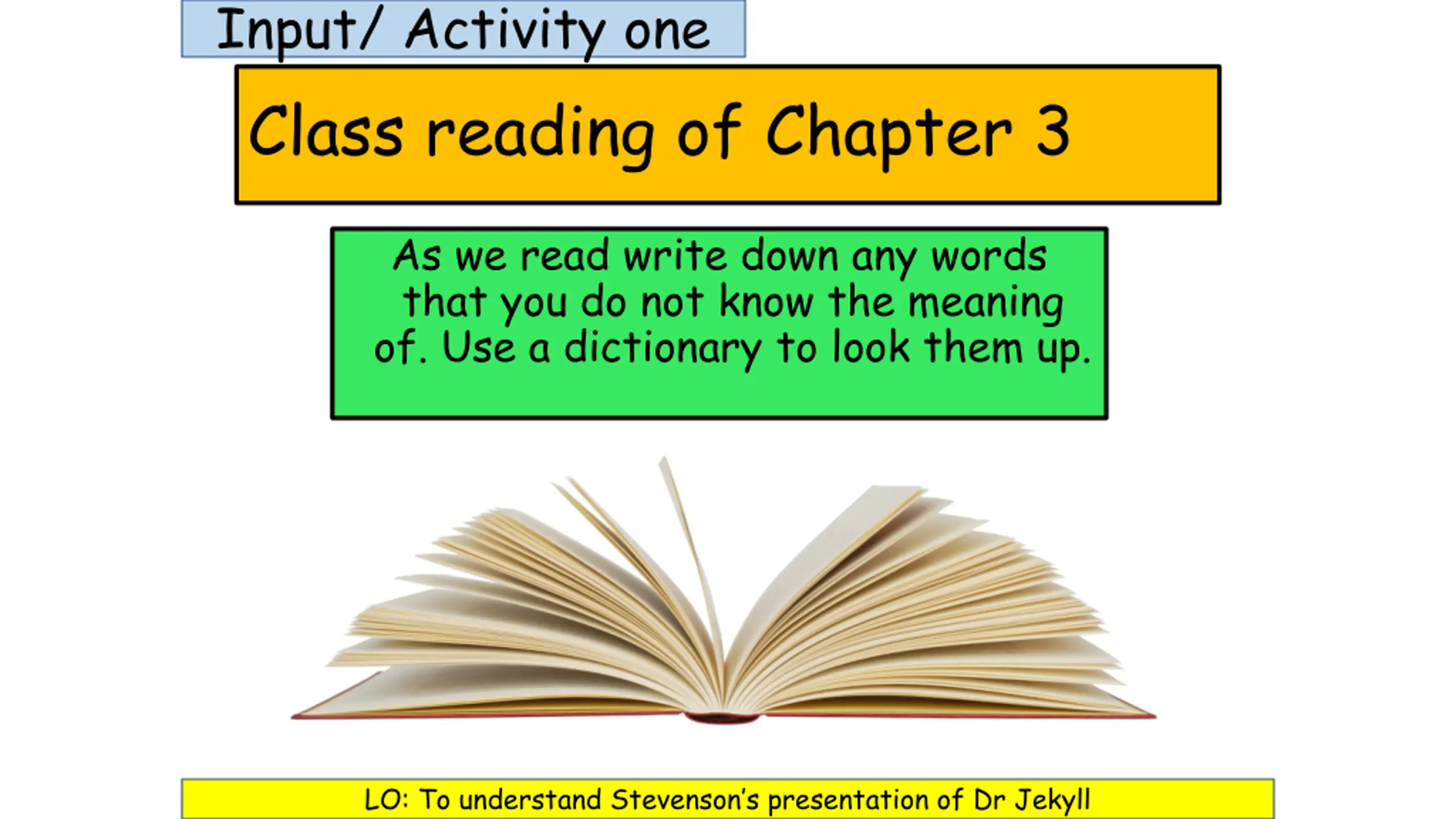 Input/ Activity one Class reading of Chapter 3 As we read write down any words that you do not know the meaning of. Use a dictionary to look them up. LO: To understand Stevenson s presentation of Dr Jekyll