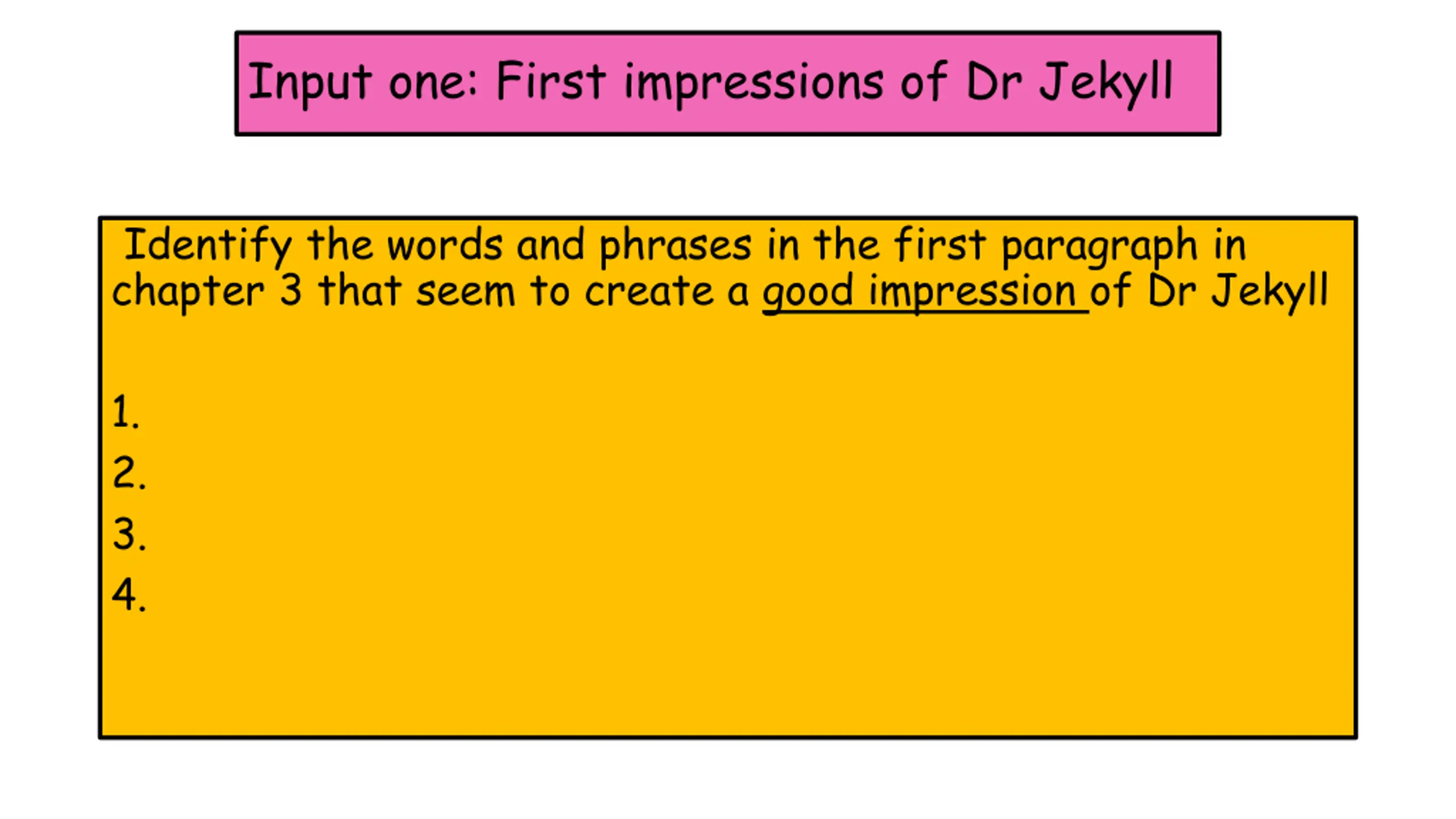 Input one: First impressions of Dr Jekyll Identify the words and phrases in the first paragraph in chapter 3 that seem to create a good impression of Dr Jekyll 1. 2. 3. 4.