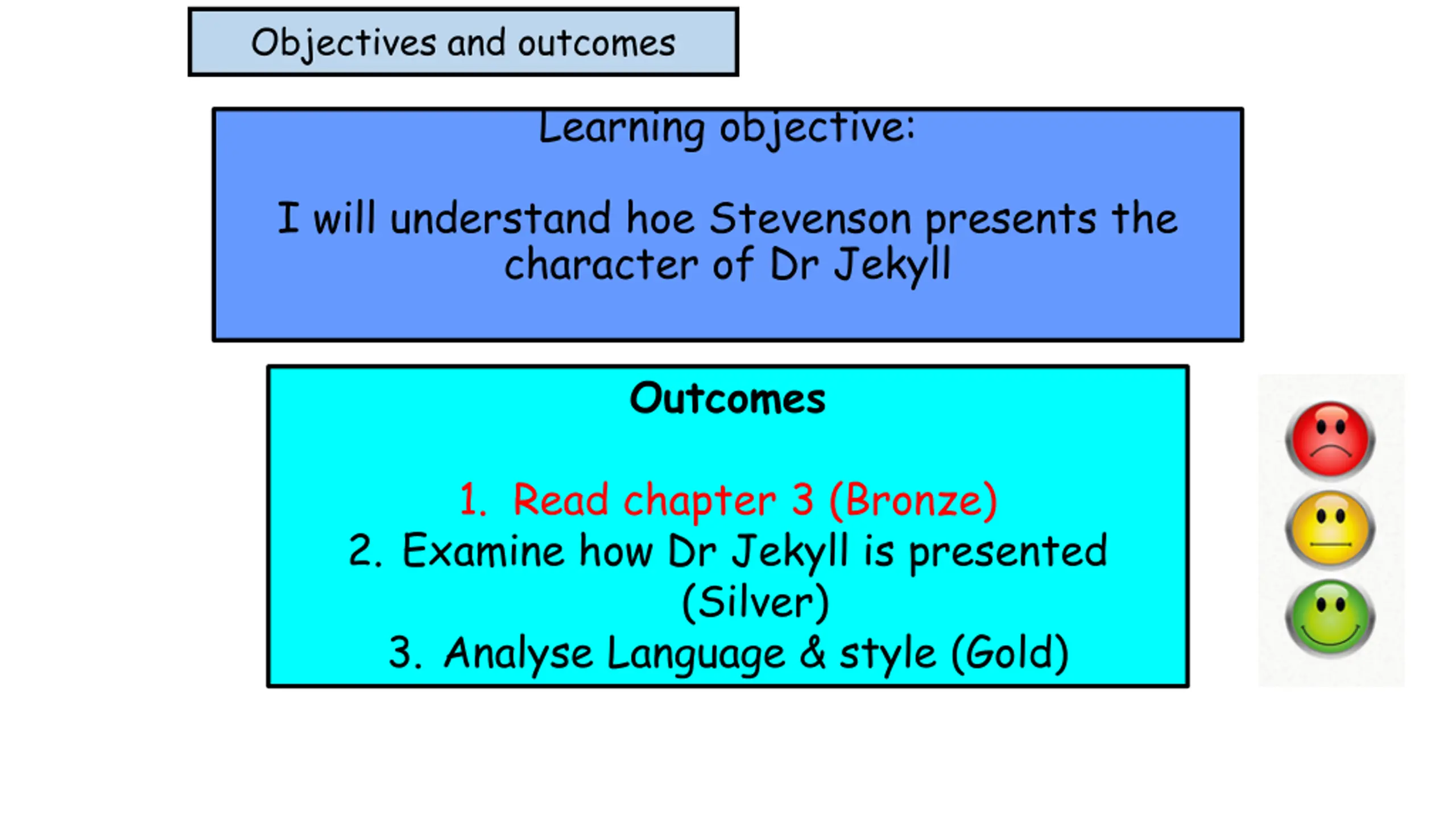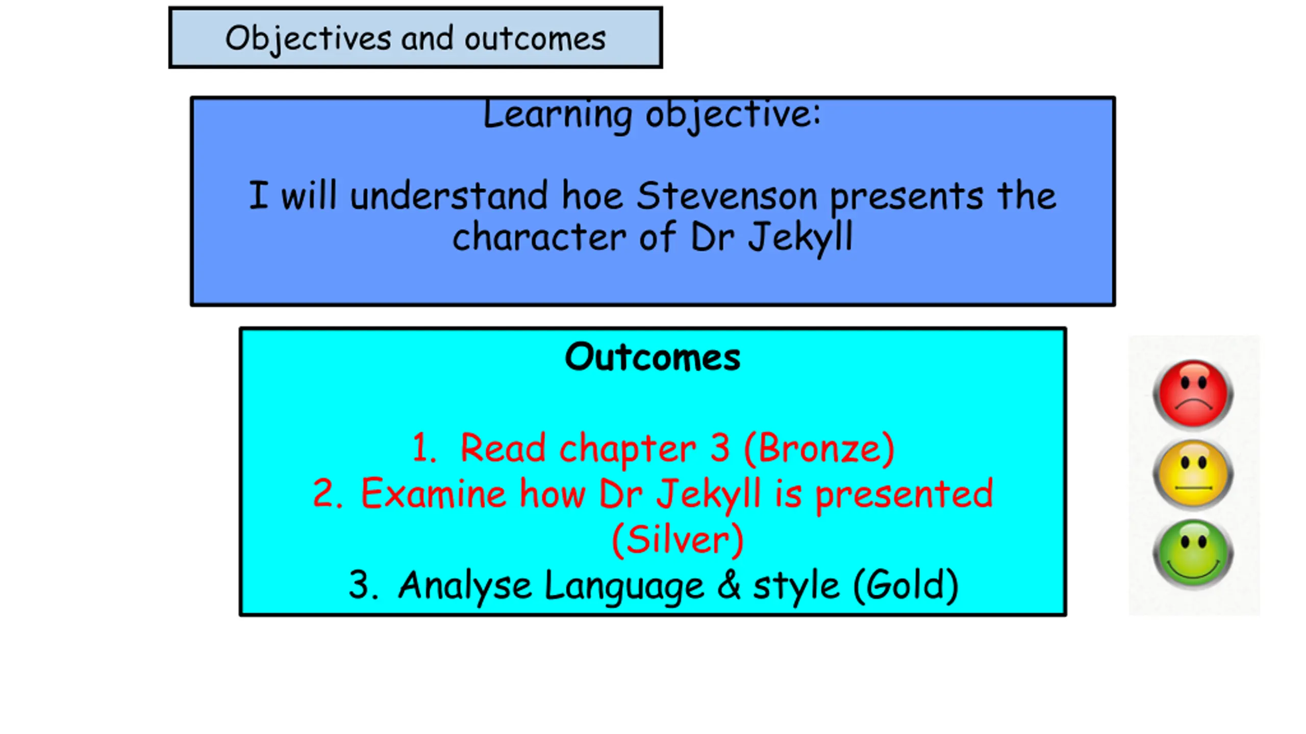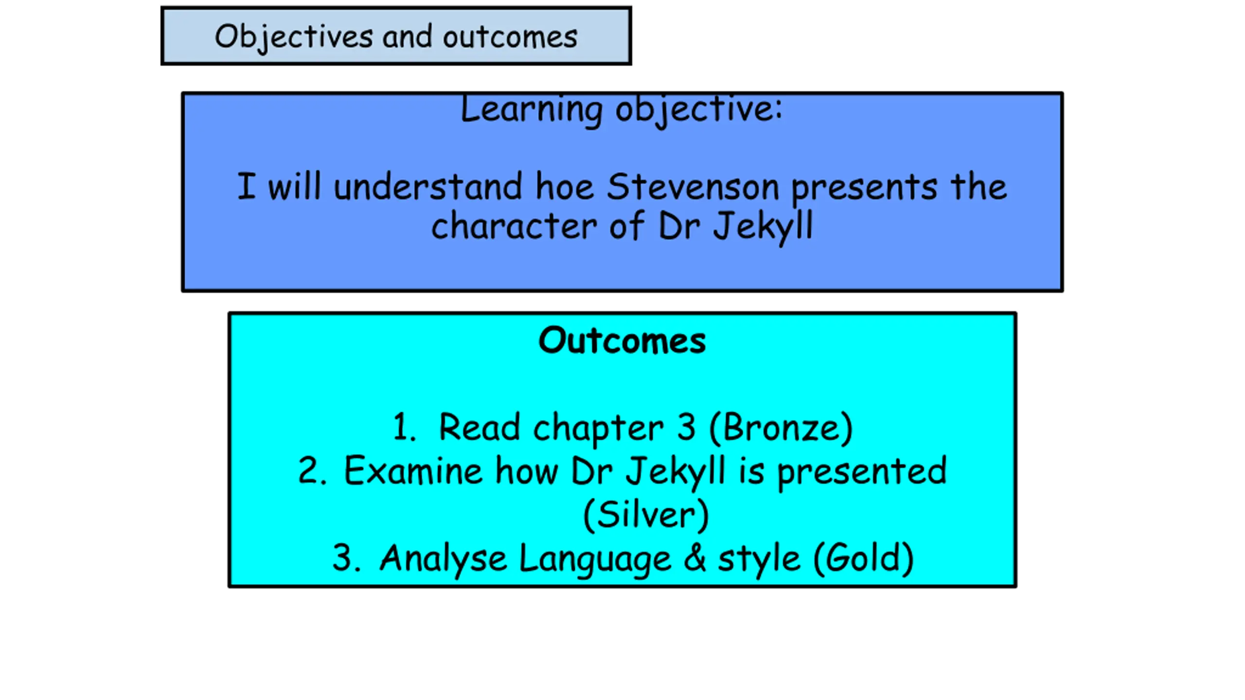 Objectives and outcomes Learning objective: I will understand hoe Stevenson presents the character of Dr Jekyll Outcomes 1. Read chapter 3 (Bronze) 2. Examine how Dr Jekyll is presented (Silver) 3. Analyse Language & style (Gold)