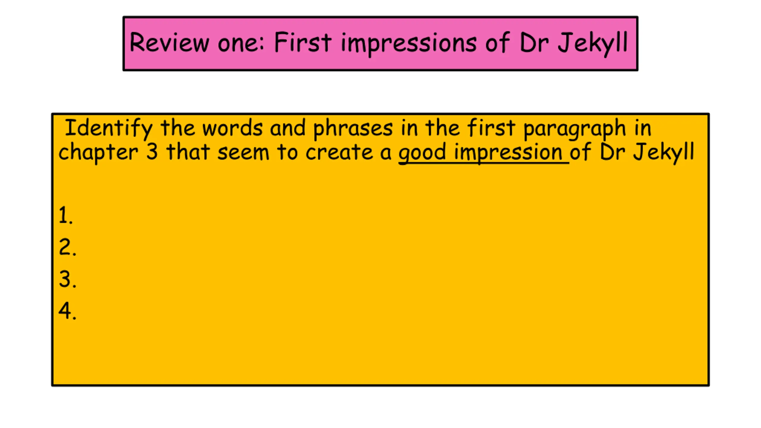 Review one: First impressions of Dr Jekyll Identify the words and phrases in the first paragraph in chapter 3 that seem to create a good impression of Dr Jekyll 1. 2. 3. 4.