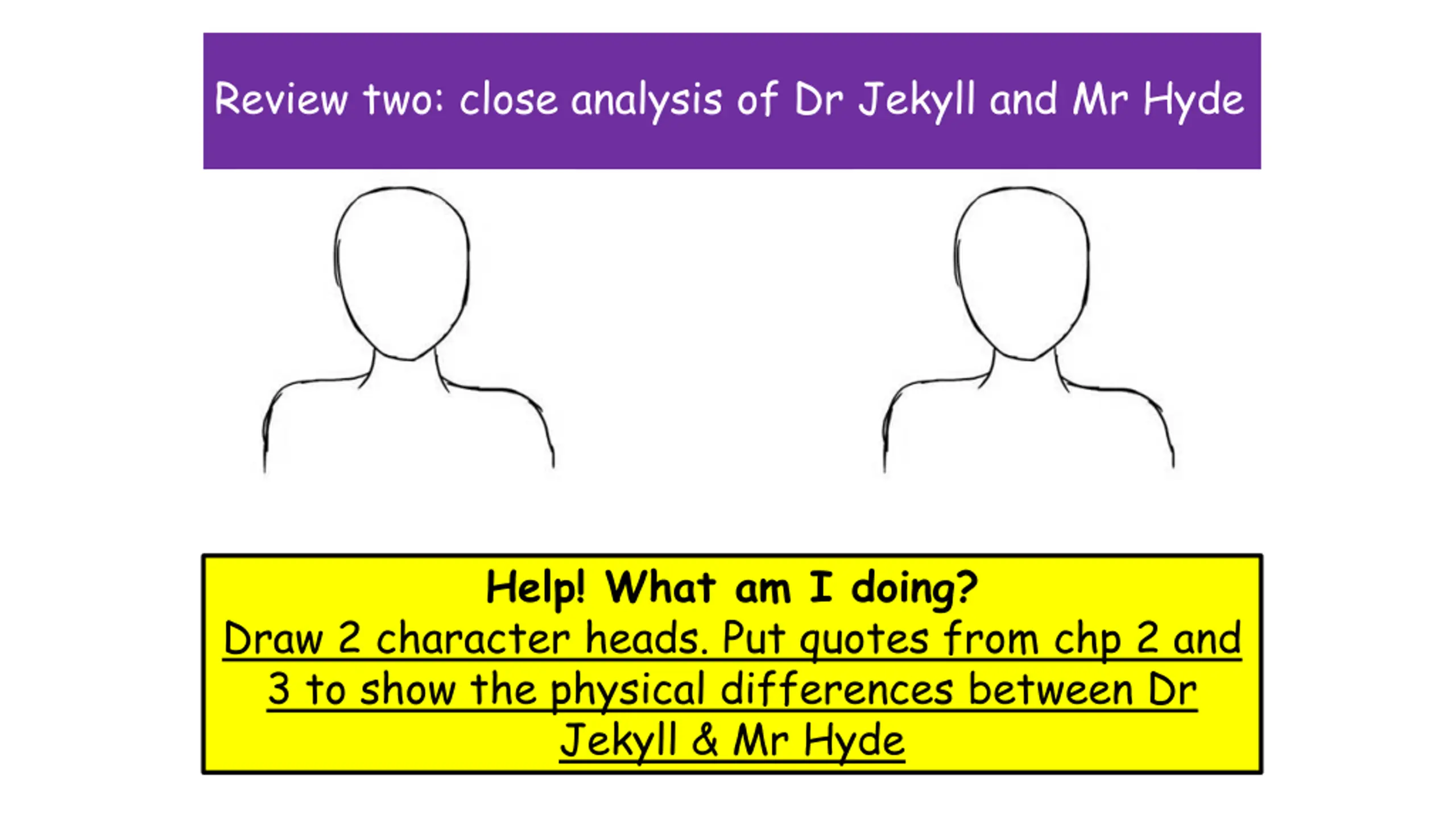 Review two: close analysis of Dr Jekyll and Mr Hyde Help! What am I doing? Draw 2 character heads. Put quotes from chp 2 and 3 to show the physical differences between Dr Jekyll & Mr Hyde