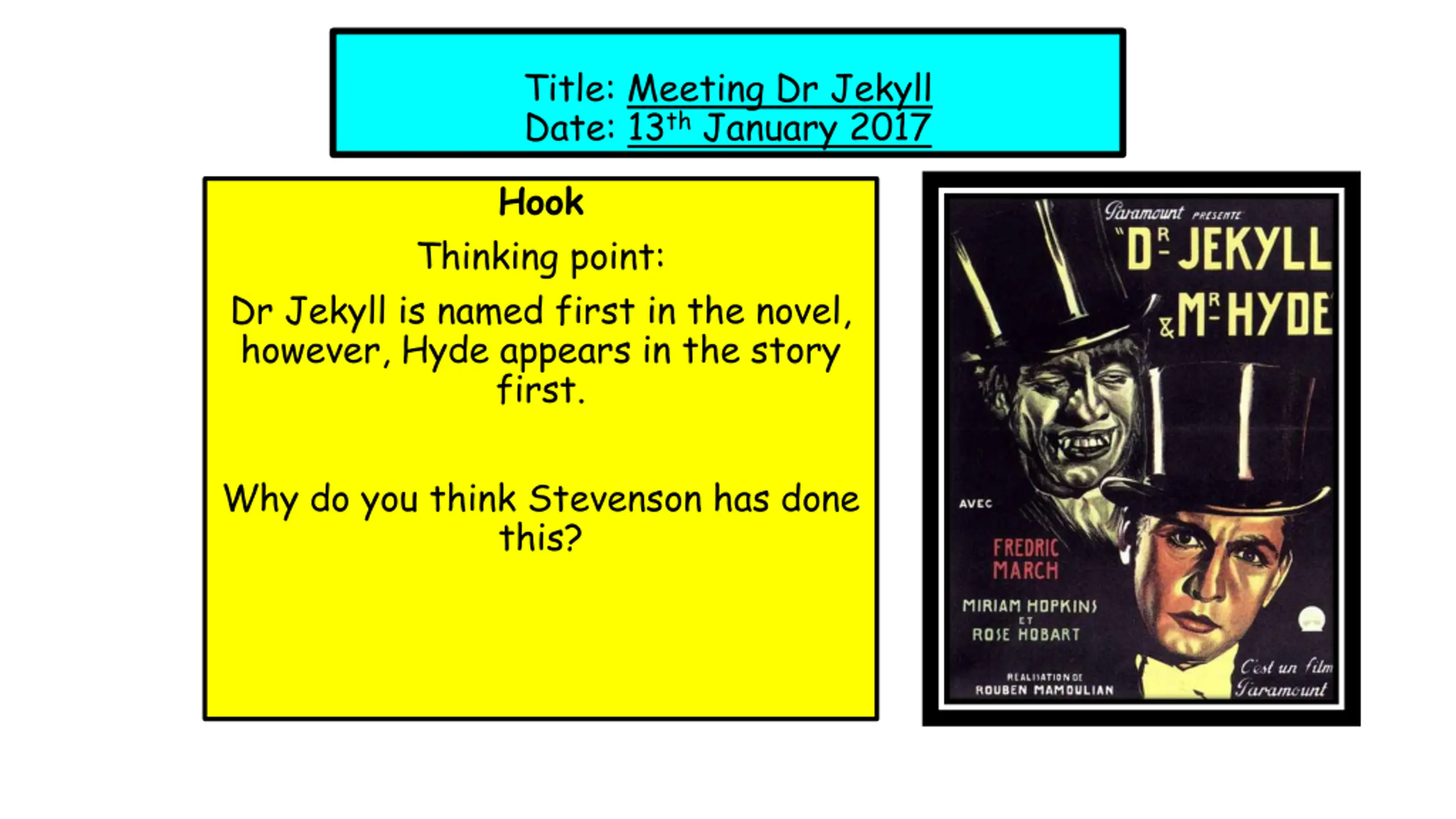 Title: Meeting Dr Jekyll Date: 13thJanuary 2017 Hook Thinking point: Dr Jekyll is named first in the novel, however, Hyde appears in the story first. Why do you think Stevenson has done this?
