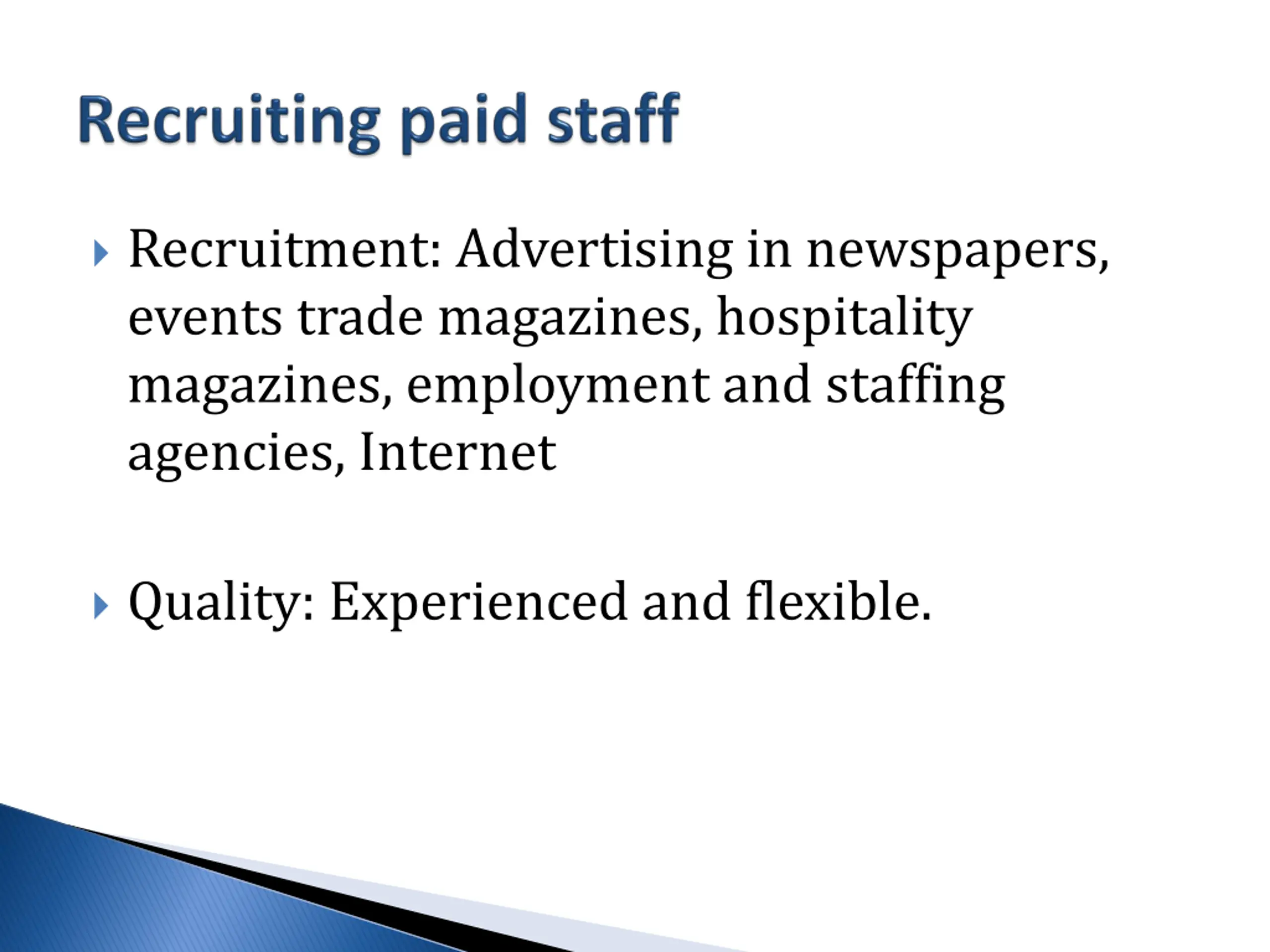 Recruitment: Advertising in newspapers, events trade magazines, hospitality magazines, employment and staffing agencies, Internet Quality: Experienced and flexible.