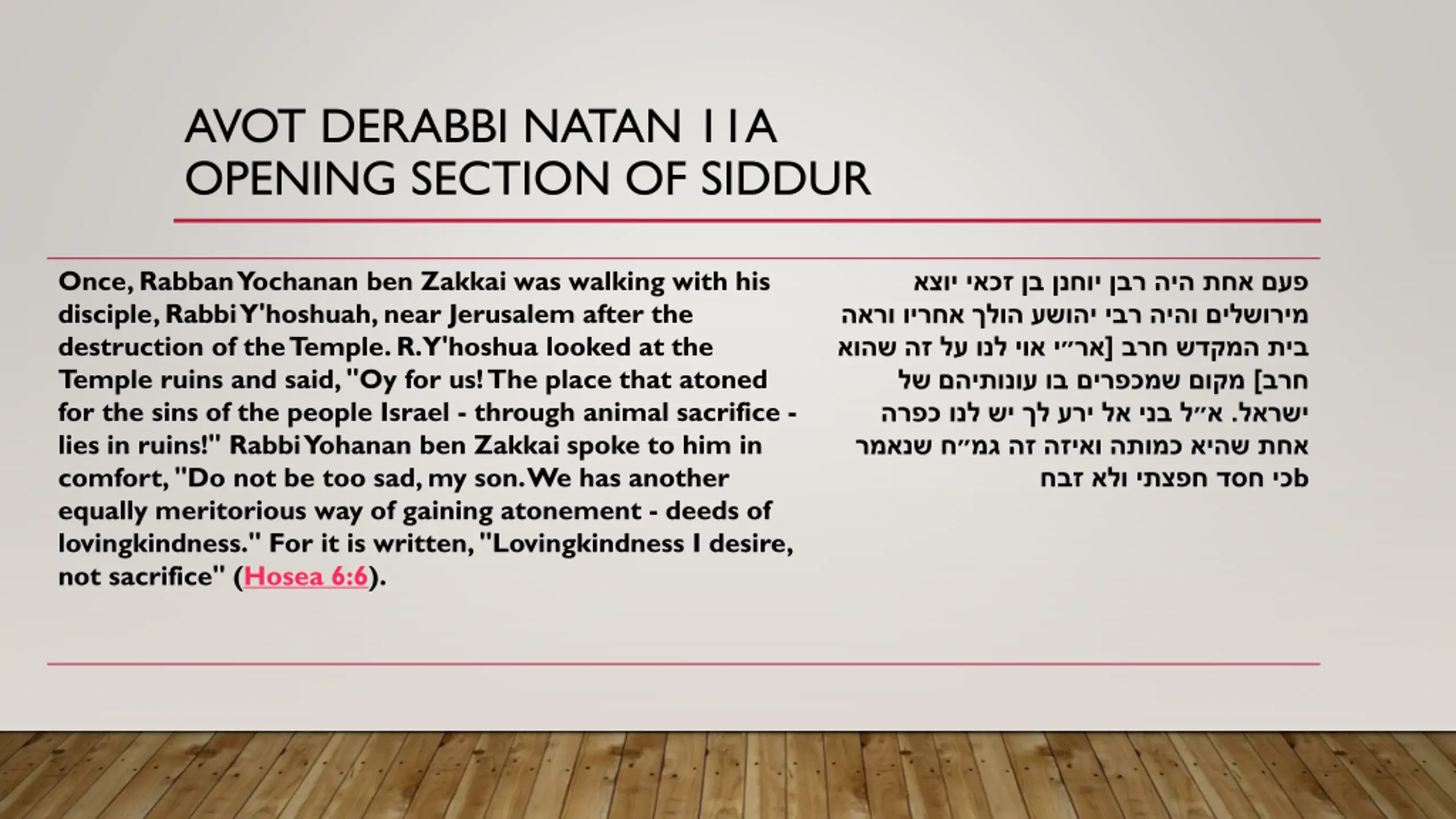 AVOT DERABBI NATAN 11A OPENING SECTION OF SIDDUR Once, RabbanYochanan ben Zakkai was walking with his disciple, Rabbi Y'hoshuah, near Jerusalem after the destruction of the Temple. R. Y'hoshua looked at the Temple ruins and said, "Oy for us! The place that atoned for the sins of the people Israel - through animal sacrifice - lies in ruins!" Rabbi Yohanan ben Zakkai spoke to him in comfort, "Do not be too sad, my son. We has another equally meritorious way of gaining atonement - deeds of lovingkindness." For it is written, "Lovingkindness I desire, not sacrifice" (Hosea 6:6). b [ ] .