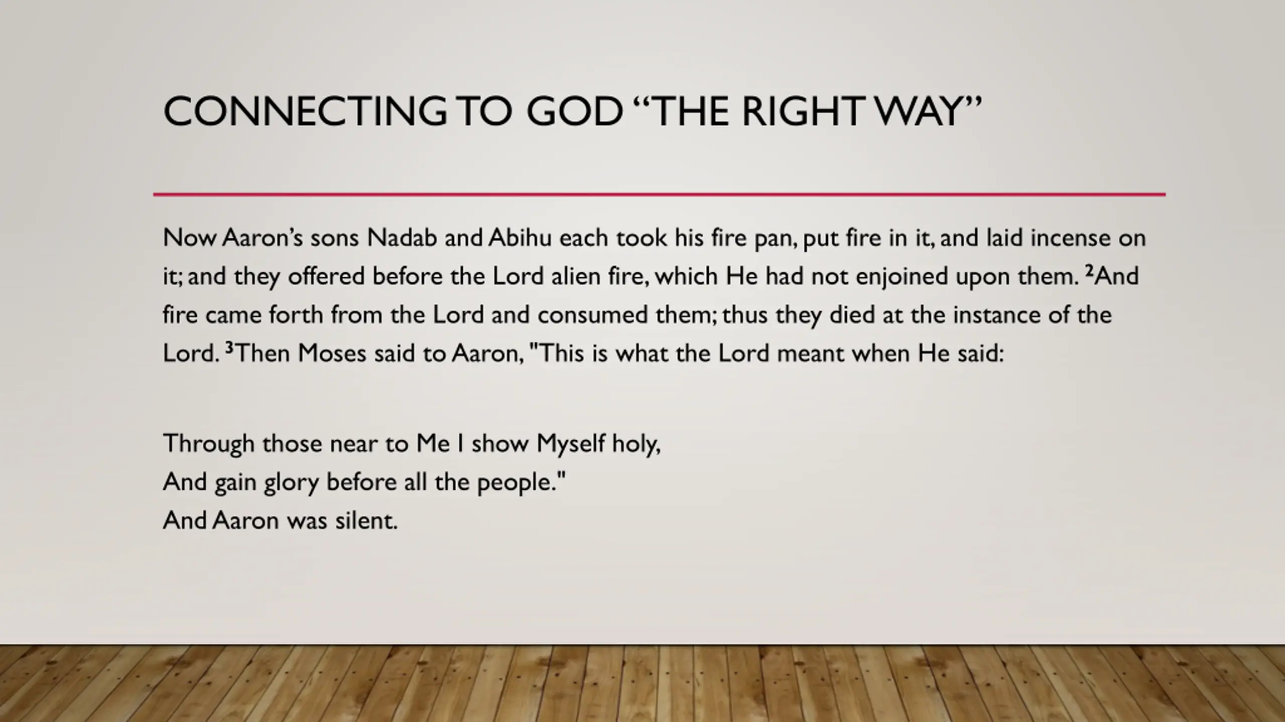 CONNECTING TO GOD THE RIGHT WAY Now Aaron s sons Nadab and Abihu each took his fire pan, put fire in it, and laid incense on it; and they offered before the Lord alien fire, which He had not enjoined upon them.2And fire came forth from the Lord and consumed them; thus they died at the instance of the Lord.3Then Moses said to Aaron, "This is what the Lord meant when He said: Through those near to Me I show Myself holy, And gain glory before all the people." And Aaron was silent.