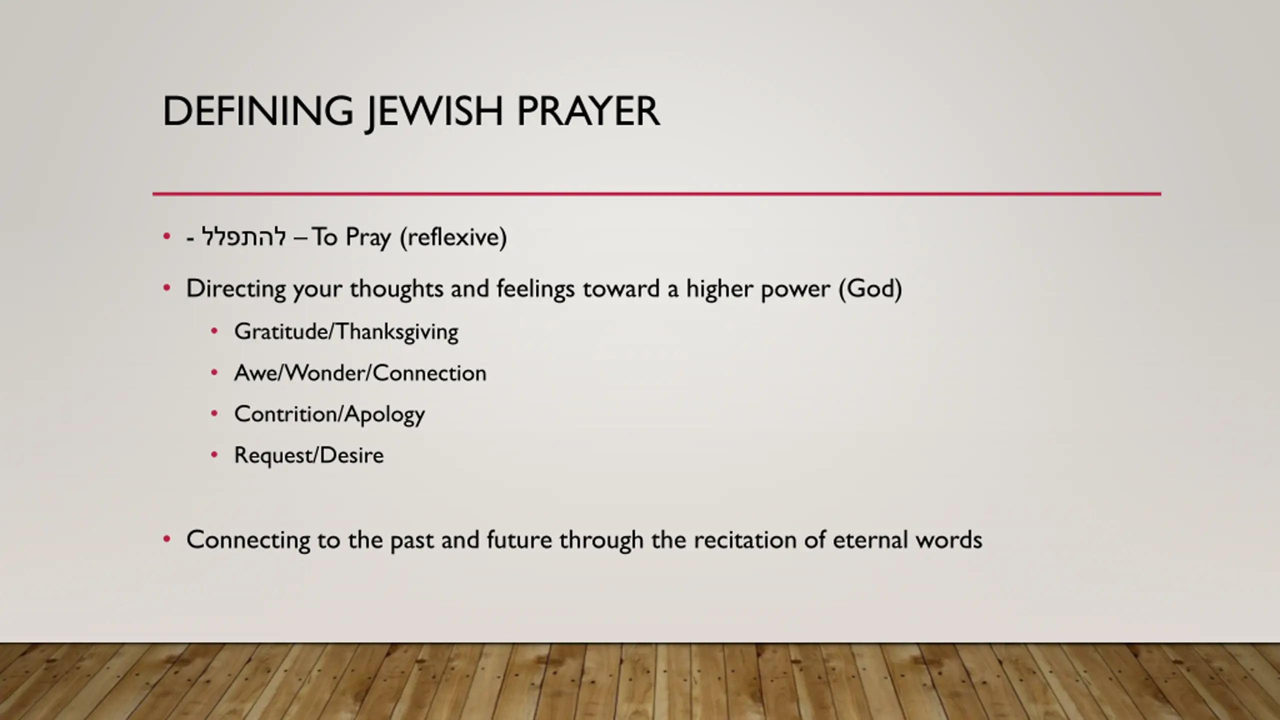 DEFINING JEWISH PRAYER - To Pray (reflexive) Directing your thoughts and feelings toward a higher power (God) Gratitude/Thanksgiving Awe/Wonder/Connection Contrition/Apology Request/Desire Connecting to the past and future through the recitation of eternal words