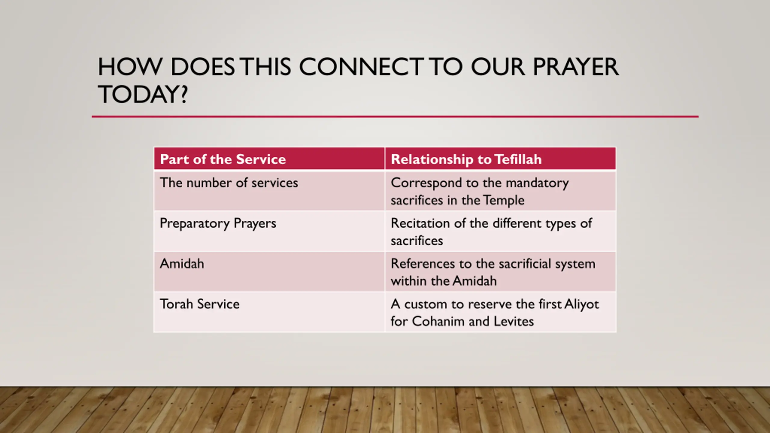 HOW DOES THIS CONNECT TO OUR PRAYER TODAY? Part of the Service The number of services Relationship to Tefillah Correspond to the mandatory sacrifices in the Temple Recitation of the different types of sacrifices References to the sacrificial system within the Amidah A custom to reserve the first Aliyot for Cohanim and Levites Preparatory Prayers Amidah Torah Service
