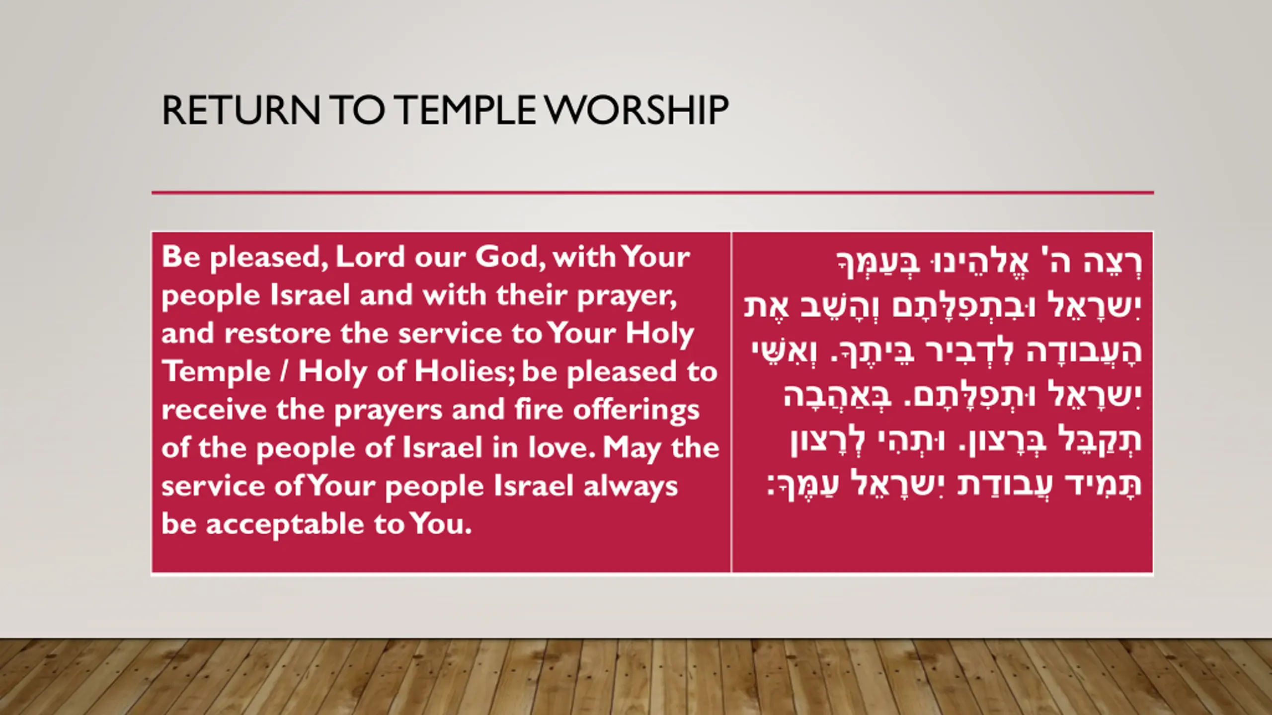 RETURN TO TEMPLE WORSHIP Be pleased, Lord our God, with Your people Israel and with their prayer, and restore the service to Your Holy Temple / Holy of Holies; be pleased to receive the prayers and fire offerings of the people of Israel in love. May the service of Your people Israel always be acceptable to You. . . : ' .