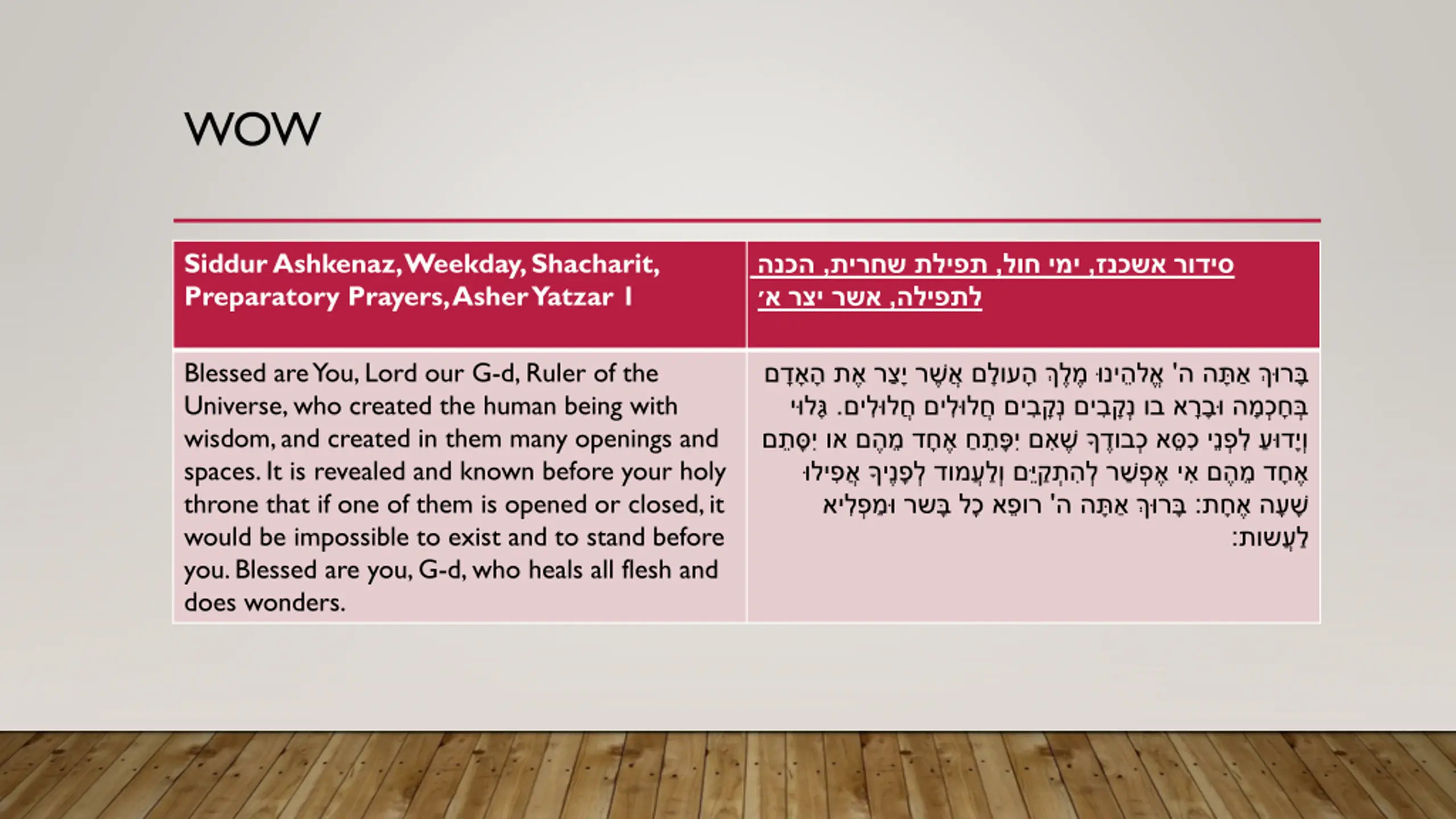 WOW Siddur Ashkenaz, Weekday, Shacharit, Preparatory Prayers, Asher Yatzar 1 , , , , Blessed are You, Lord our G-d, Ruler of the Universe, who created the human being with wisdom, and created in them many openings and spaces. It is revealed and known before your holy throne that if one of them is opened or closed, it would be impossible to exist and to stand before you. Blessed are you, G-d, who heals all flesh and does wonders. . ' ' : :