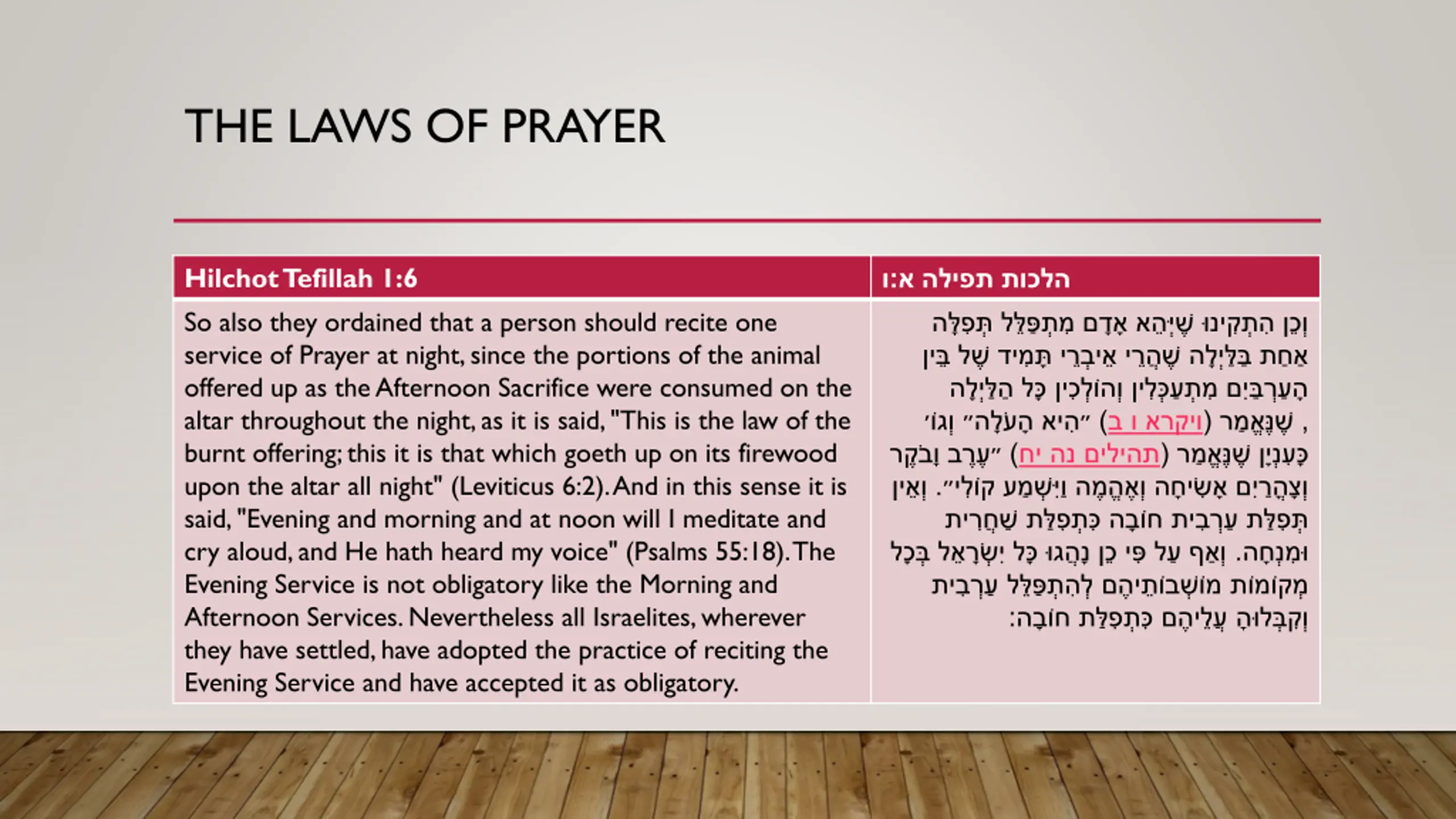 THE LAWS OF PRAYER Hilchot Tefillah 1:6 So also they ordained that a person should recite one service of Prayer at night, since the portions of the animal offered up as the Afternoon Sacrifice were consumed on the altar throughout the night, as it is said, "This is the law of the burnt offering; this it is that which goeth up on its firewood upon the altar all night" (Leviticus 6:2). And in this sense it is said, "Evening and morning and at noon will I meditate and cry aloud, and He hath heard my voice" (Psalms 55:18). The Evening Service is not obligatory like the Morning and Afternoon Services. Nevertheless all Israelites, wherever they have settled, have adopted the practice of reciting the Evening Service and have accepted it as obligatory. : ) ) . : ( , ( .