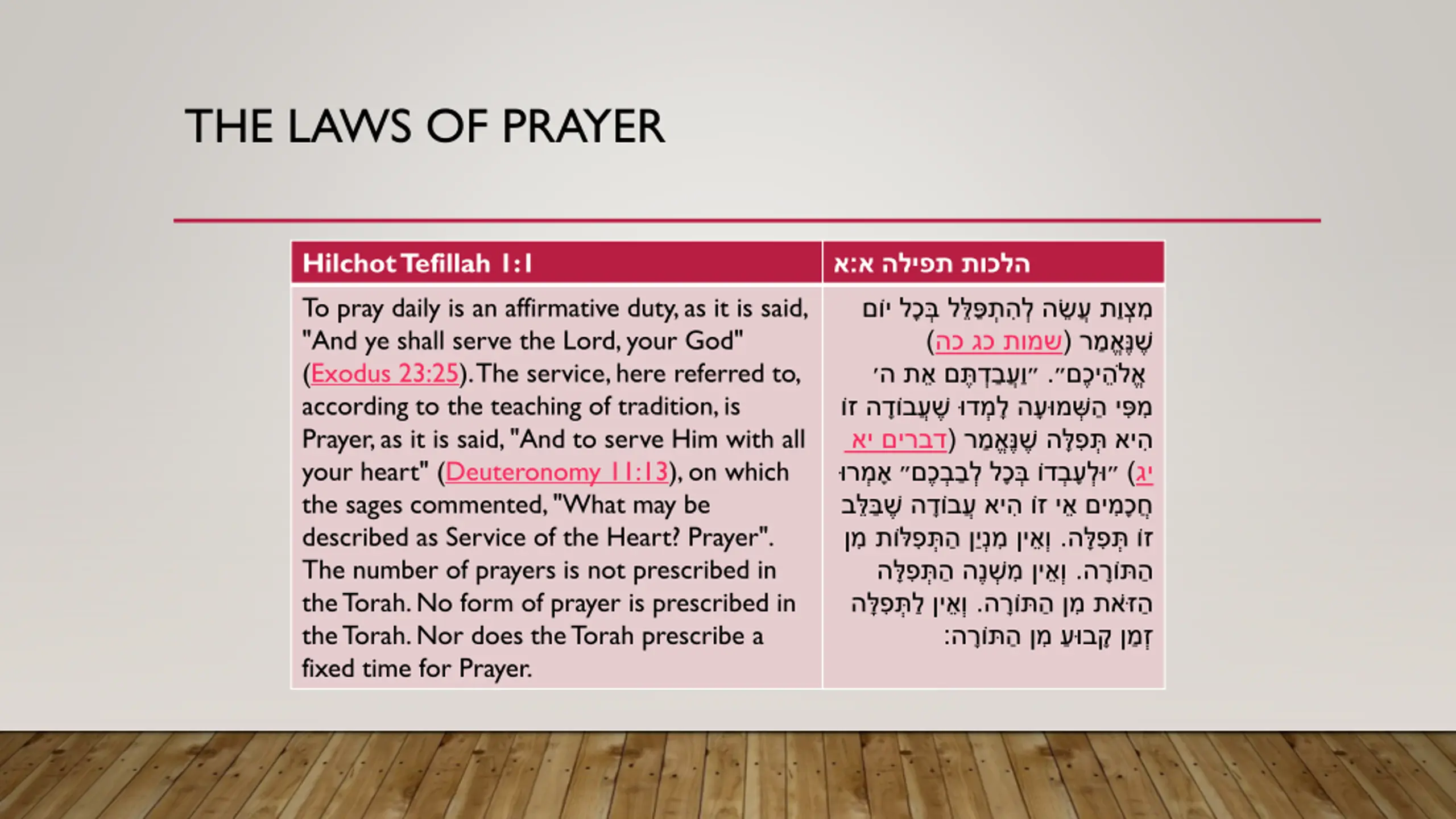 THE LAWS OF PRAYER HilchotTefillah 1:1 To pray daily is an affirmative duty, as it is said, "And ye shall serve the Lord, your God" (Exodus 23:25). The service, here referred to, according to the teaching of tradition, is Prayer, as it is said, "And to serve Him with all your heart" (Deuteronomy 11:13), on which the sages commented, "What may be described as Service of the Heart? Prayer". The number of prayers is not prescribed in the Torah. No form of prayer is prescribed in the Torah. Nor does the Torah prescribe a fixed time for Prayer. : ) ( . : ( . ) . .