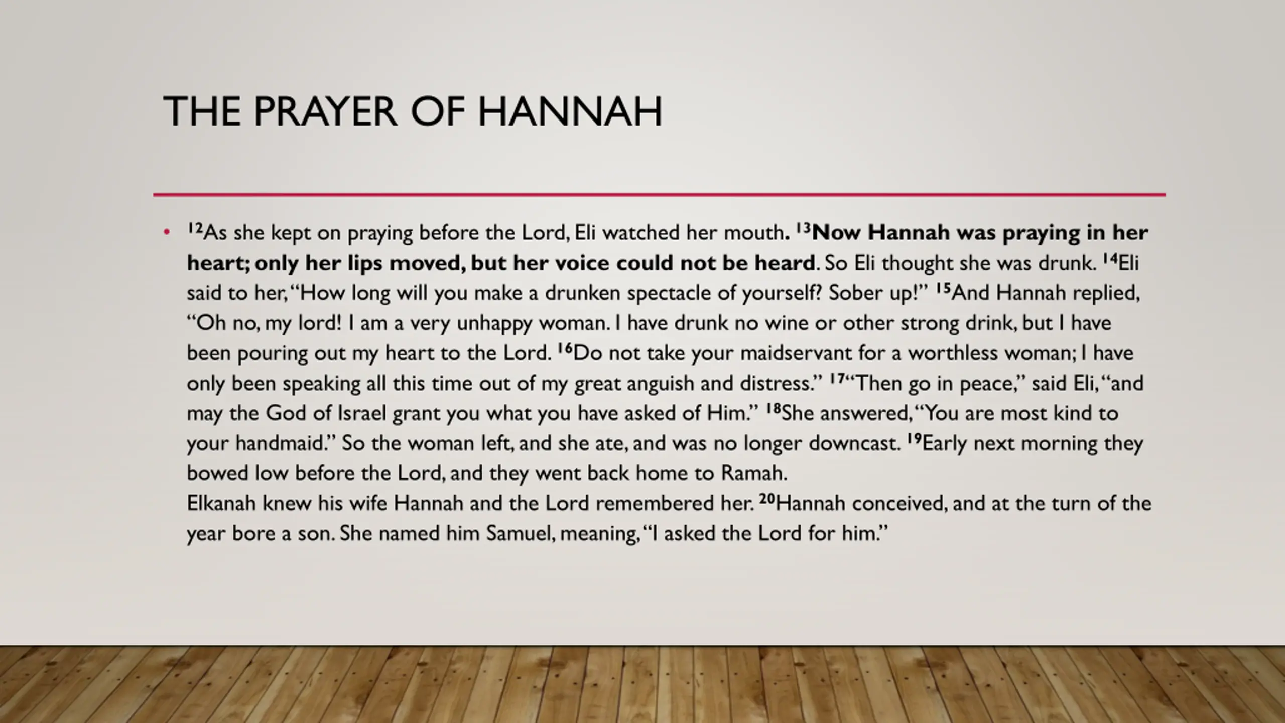 THE PRAYER OF HANNAH 12As she kept on praying before the Lord, Eli watched her mouth.13Now Hannah was praying in her heart; only her lips moved, but her voice could not be heard. So Eli thought she was drunk.14Eli said to her, How long will you make a drunken spectacle of yourself? Sober up! 15And Hannah replied, Oh no, my lord! I am a very unhappy woman. I have drunk no wine or other strong drink, but I have been pouring out my heart to the Lord.16Do not take your maidservant for a worthless woman; I have only been speaking all this time out of my great anguish and distress. 17 Then go in peace, said Eli, and may the God of Israel grant you what you have asked of Him. 18She answered, You are most kind to your handmaid. So the woman left, and she ate, and was no longer downcast.19Early next morning they bowed low before the Lord, and they went back home to Ramah. Elkanah knew his wife Hannah and the Lord remembered her.20Hannah conceived, and at the turn of the year bore a son. She named him Samuel, meaning, I asked the Lord for him.