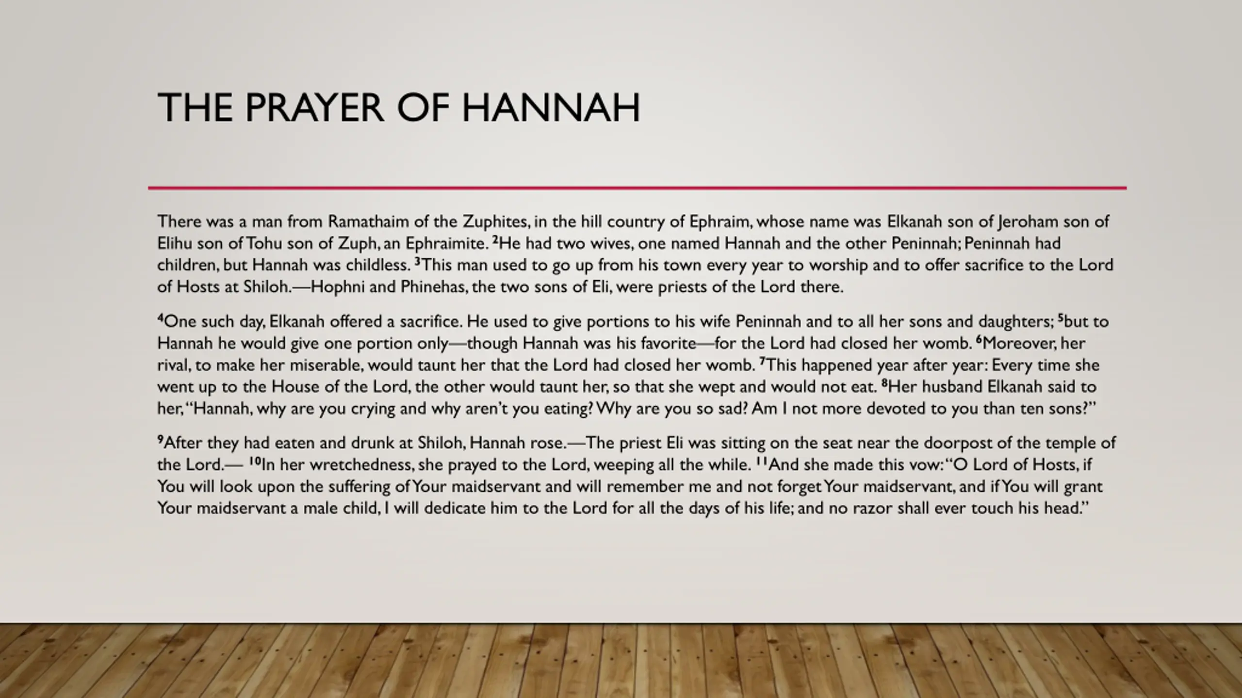 THE PRAYER OF HANNAH There was a man from Ramathaim of the Zuphites, in the hill country of Ephraim, whose name was Elkanah son of Jeroham son of Elihu son of Tohu son of Zuph, an Ephraimite.2He had two wives, one named Hannah and the other Peninnah; Peninnah had children, but Hannah was childless.3This man used to go up from his town every year to worship and to offer sacrifice to the Lord of Hosts at Shiloh. Hophni and Phinehas, the two sons of Eli, were priests of the Lord there. 4One such day, Elkanah offered a sacrifice. He used to give portions to his wife Peninnah and to all her sons and daughters;5but to Hannah he would give one portion only though Hannah was his favorite for the Lord had closed her womb.6Moreover, her rival, to make her miserable, would taunt her that the Lord had closed her womb.7This happened year after year: Every time she went up to the House of the Lord, the other would taunt her, so that she wept and would not eat.8Her husband Elkanah said to her, Hannah, why are you crying and why aren t you eating? Why are you so sad? Am I not more devoted to you than ten sons? 9After they had eaten and drunk at Shiloh, Hannah rose. The priest Eli was sitting on the seat near the doorpost of the temple of the Lord. 10In her wretchedness, she prayed to the Lord, weeping all the while.11And she made this vow: O Lord of Hosts, if You will look upon the suffering of Your maidservant and will remember me and not forget Your maidservant, and if You will grant Your maidservant a male child, I will dedicate him to the Lord for all the days of his life; and no razor shall ever touch his head.