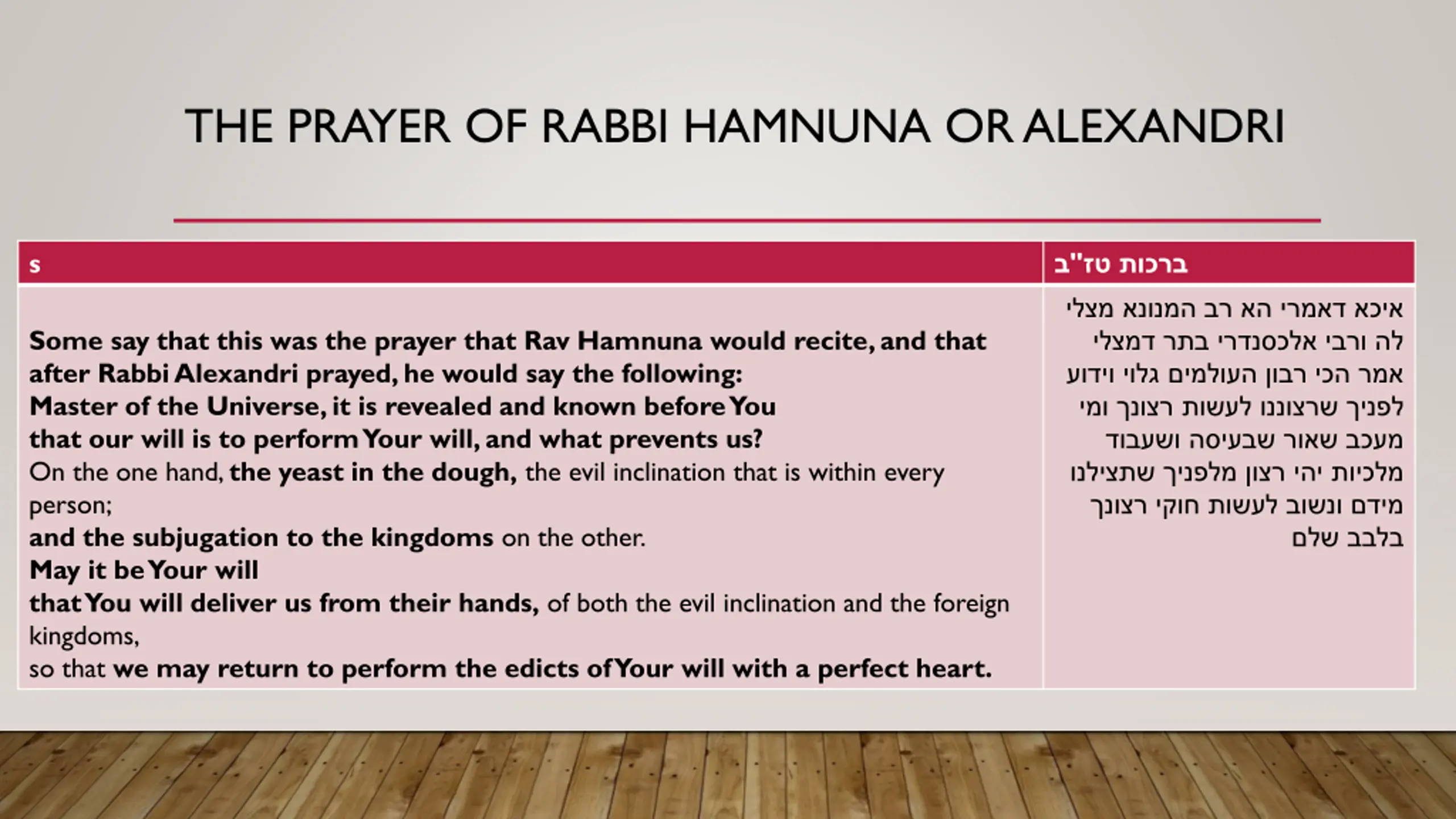 THE PRAYER OF RABBI HAMNUNA OR ALEXANDRI s '' Some say that this was the prayer that Rav Hamnuna would recite, and that after Rabbi Alexandri prayed, he would say the following: Master of the Universe, it is revealed and known before You that our will is to perform Your will, and what prevents us? On the one hand, the yeast in the dough, the evil inclination that is within every person; and the subjugation to the kingdoms on the other. May it be Your will that You will deliver us from their hands, of both the evil inclination and the foreign kingdoms, so that we may return to perform the edicts of Your will with a perfect heart.
