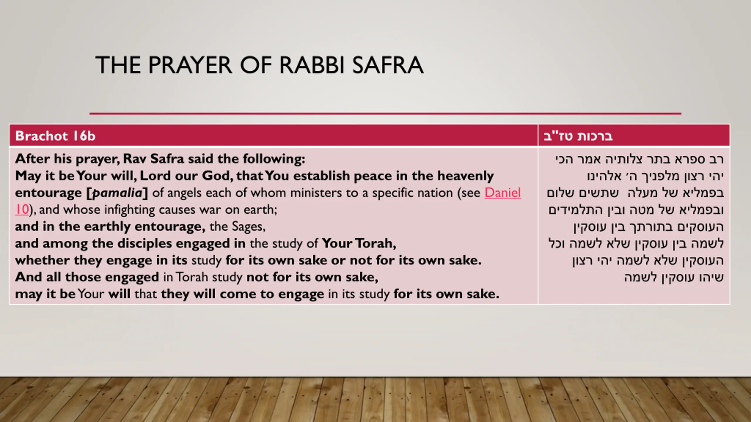 THE PRAYER OF RABBI SAFRA Brachot 16b After his prayer, Rav Safra said the following: May it be Your will, Lord our God, that You establish peace in the heavenly entourage [pamalia] of angels each of whom ministers to a specific nation (see Daniel 10), and whose infighting causes war on earth; and in the earthly entourage, the Sages, and among the disciples engaged in the study of Your Torah, whether they engage in its study for its own sake or not for its own sake. And all those engaged in Torah study not for its own sake, may it beYour will that they will come to engage in its study for its own sake. ''