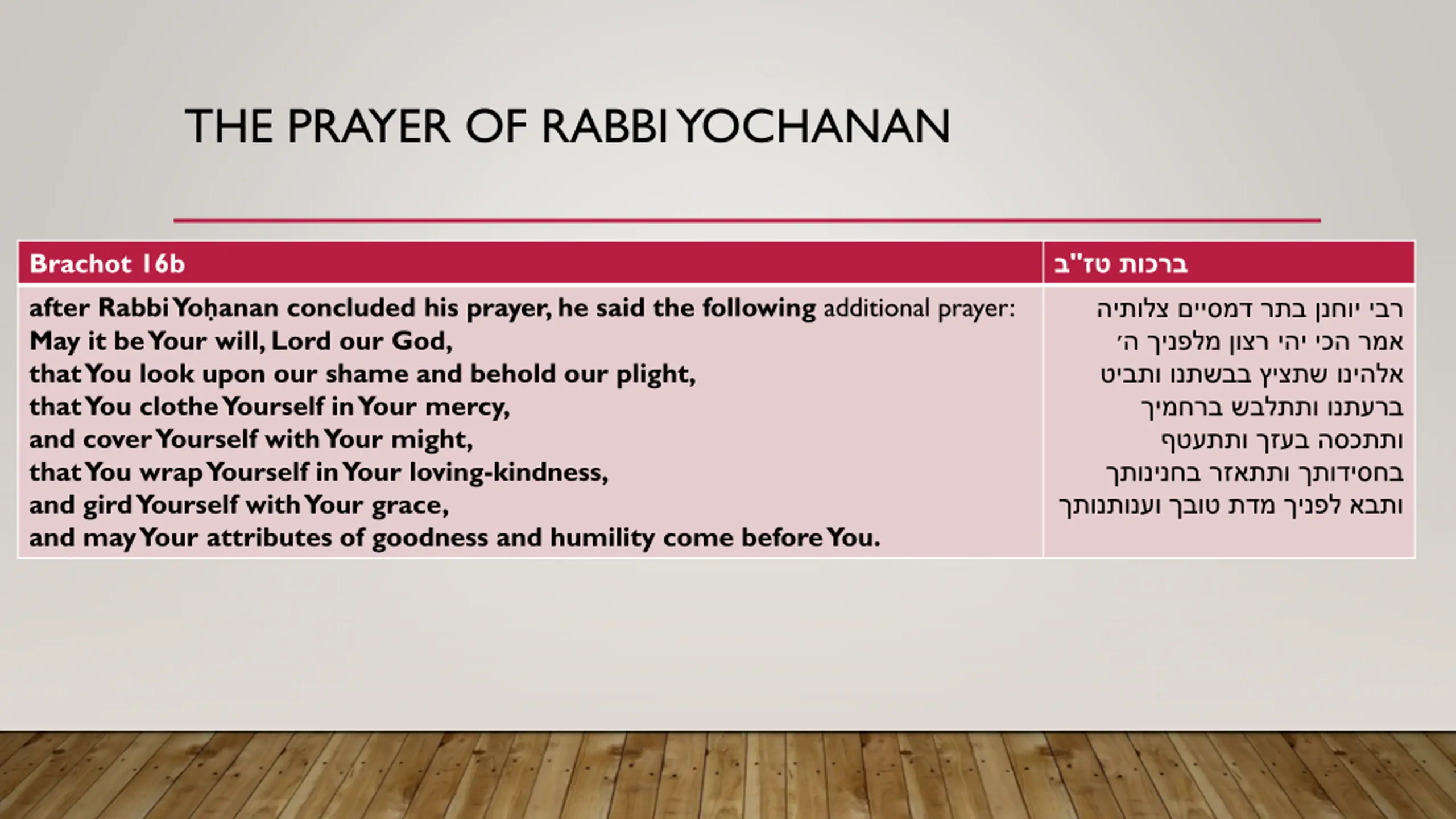 THE PRAYER OF RABBI YOCHANAN Brachot 16b after Rabbi Yo anan concluded his prayer, he said the following additional prayer: May it be Your will, Lord our God, that You look upon our shame and behold our plight, that You clothe Yourself in Your mercy, and cover Yourself with Your might, that You wrap Yourself in Your loving-kindness, and gird Yourself with Your grace, and may Your attributes of goodness and humility come before You. ''