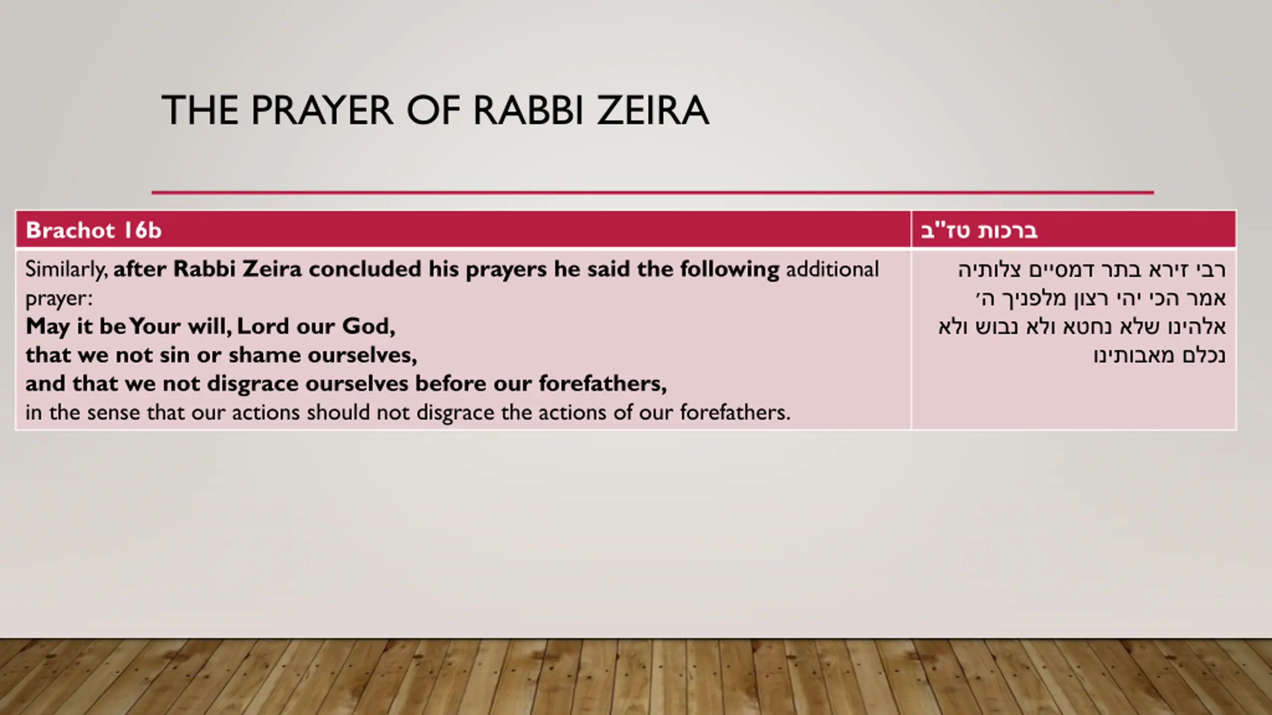 THE PRAYER OF RABBI ZEIRA Brachot 16b Similarly, after Rabbi Zeira concluded his prayers he said the following additional prayer: May it be Your will, Lord our God, that we not sin or shame ourselves, and that we not disgrace ourselves before our forefathers, in the sense that our actions should not disgrace the actions of our forefathers. ''