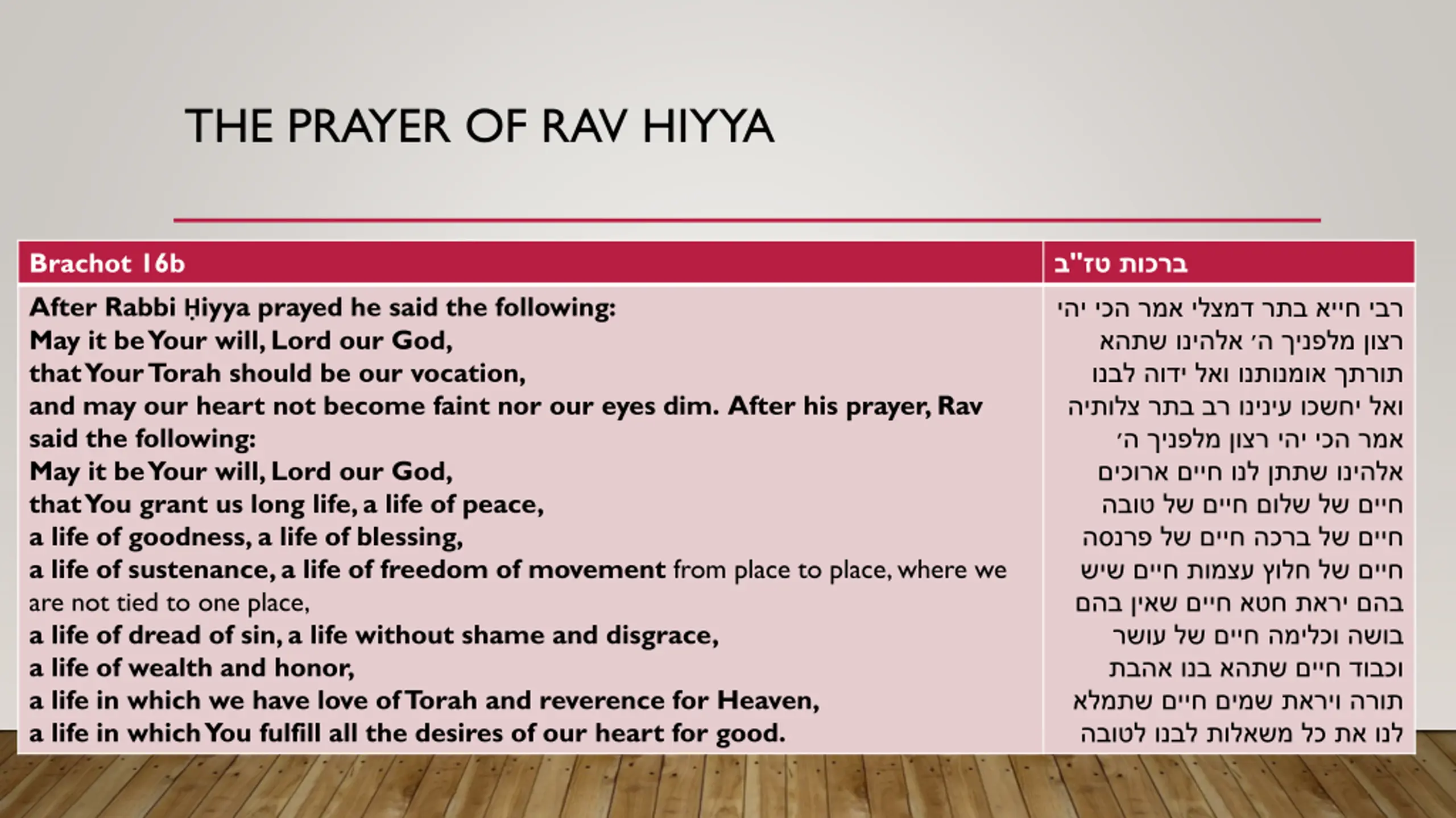 THE PRAYER OF RAV HIYYA Brachot 16b After Rabbi iyya prayed he said the following: May it be Your will, Lord our God, that Your Torah should be our vocation, and may our heart not become faint nor our eyes dim. After his prayer, Rav said the following: May it be Your will, Lord our God, that You grant us long life, a life of peace, a life of goodness, a life of blessing, a life of sustenance, a life of freedom of movement from place to place, where we are not tied to one place, a life of dread of sin, a life without shame and disgrace, a life of wealth and honor, a life in which we have love of Torah and reverence for Heaven, a life in which You fulfill all the desires of our heart for good. ''