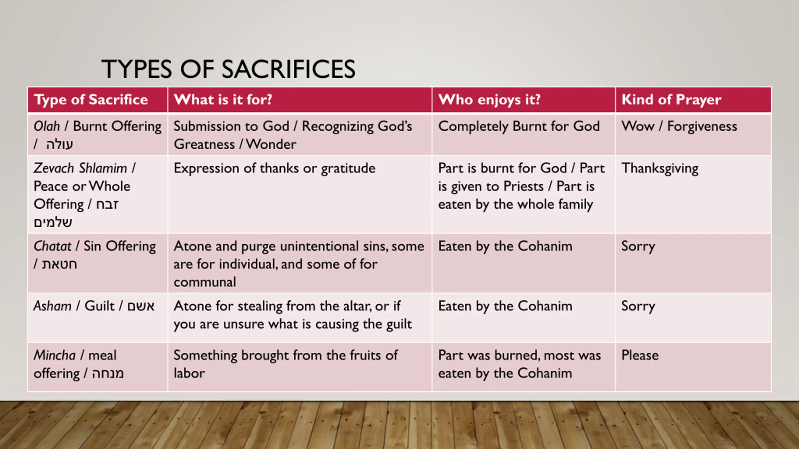 TYPES OF SACRIFICES Type of Sacrifice What is it for? Who enjoys it? Kind of Prayer Olah / Burnt Offering / Zevach Shlamim / Peace or Whole Offering / Chatat / Sin Offering / Submission to God / Recognizing God s Greatness / Wonder Expression of thanks or gratitude Completely Burnt for God Wow / Forgiveness Part is burnt for God / Part is given to Priests / Part is eaten by the whole family Thanksgiving Atone and purge unintentional sins, some are for individual, and some of for communal Atone for stealing from the altar, or if you are unsure what is causing the guilt Eaten by the Cohanim Sorry Eaten by the Cohanim Sorry Asham / Guilt / Mincha / meal offering / Something brought from the fruits of labor Part was burned, most was eaten by the Cohanim Please